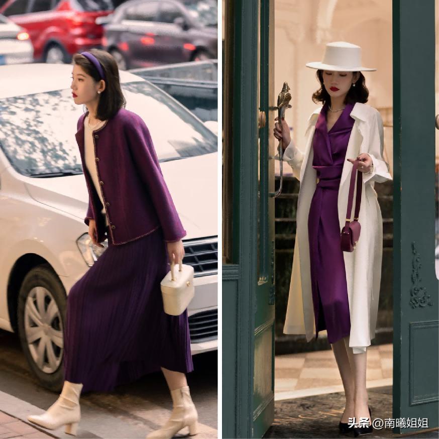紫色系列的搭配尤其是深色調,我們在進行其他顏色加入進來的時候,經典的白色系絕對是首選。而且又能夠將高級、利落和沉穩以及溫柔感這樣的氣質特徵融爲一體。