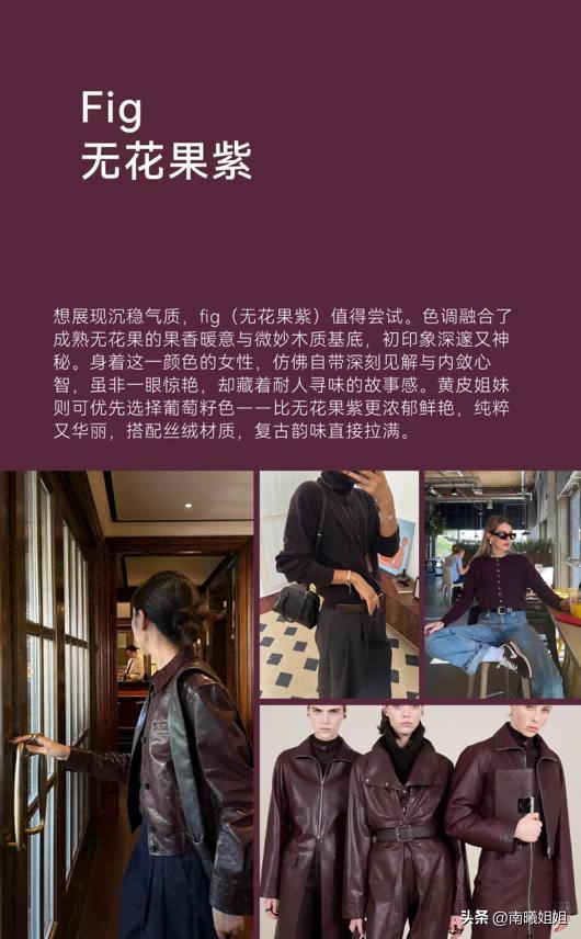 最後一款色調的推薦就是紫色調當中飽和度很低,而且深度也比較明顯的無花果紫,這一款紫色調相比較於淺色系列所襯托出來的貴氣感真的是非常明顯的,而且對於肌膚的狀態顯白效果也能夠彰顯的更加具有強調力度,尤其是年紀比較大的女性,穿這一款色系,真的非常凸顯好的氣質狀態。