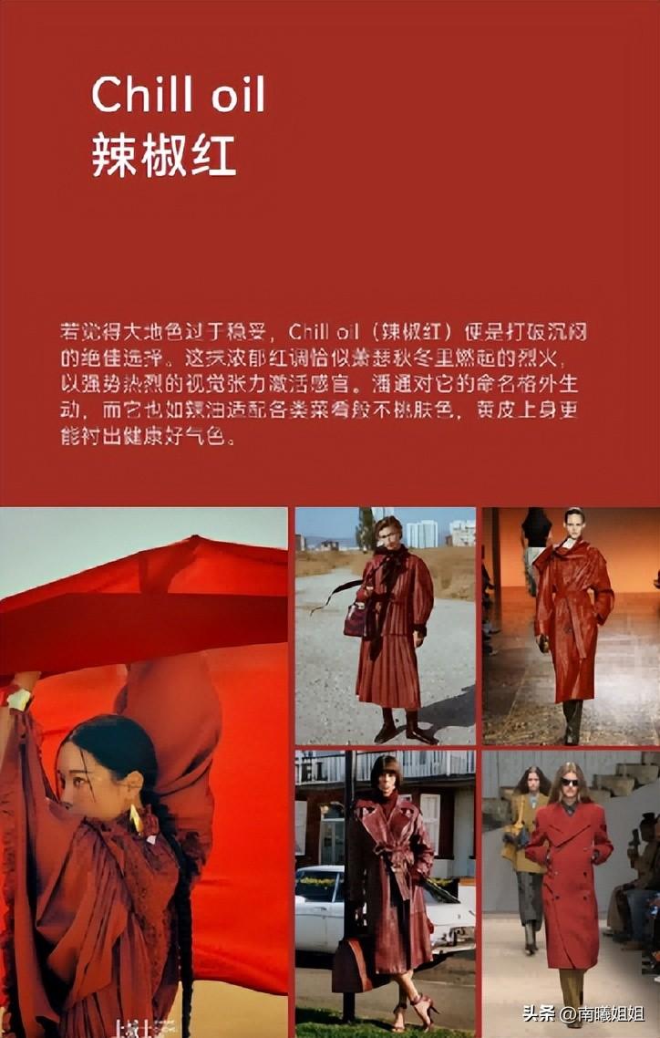 紅色調的搭配尤其是大紅色、深紅色的種類真的是自帶顯白的效果在的,所以在今年的秋冬季還有一款高級亮眼的流行色就是辣椒紅,這款色調對於年齡和風格的走向幾乎都沒有限制,在沉悶的冬季當中作爲一抹穩定還好看的亮色所在,真的是屬於熱烈高級的視覺優勢體現了,趕快選擇將其進行搭配應用吧!