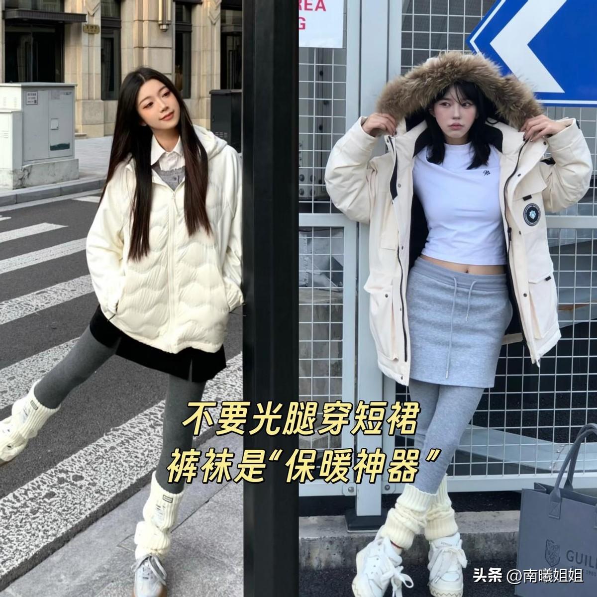 羽絨服配短裙,再疊加一件加絨款的灰色褲襪,搭配上白色堆堆襪,超有氛圍感,而且還能襯托的雙腿更加纖細修長,時髦保暖一把抓。