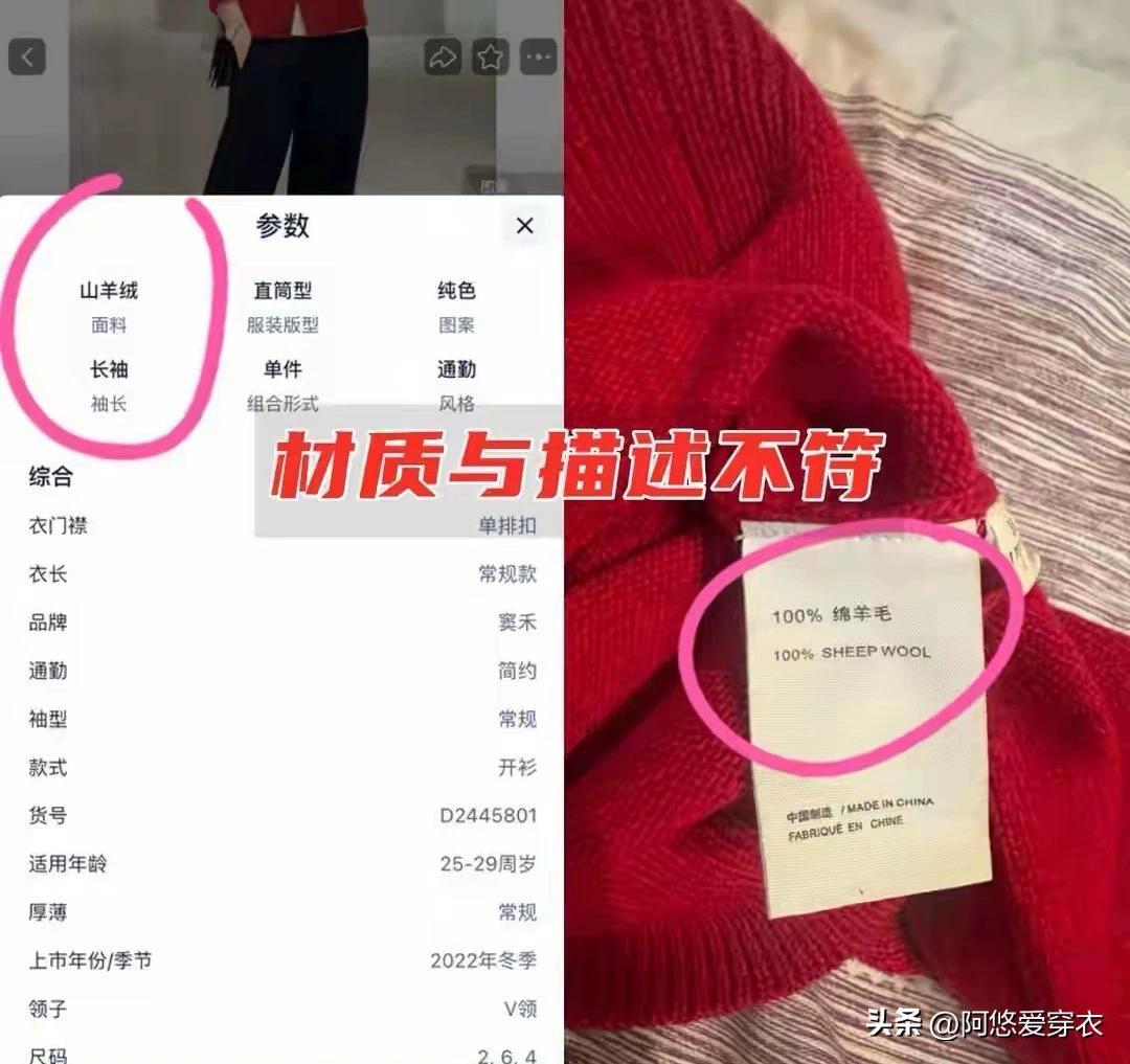 所以姐妹們一定要警惕這一點,網購直播間買回家的衣服,第一步就是查看衣服的吊牌,看上面的材質、尺碼信息和商家產品界面的信息是不是相符的,有很多衣服在線上描述的是很高檔的面料,可到手的衣服料子卻是差了好幾個檔次的劣質面料,那咱們就不要留了,必須得第一時間就找商家退貨。