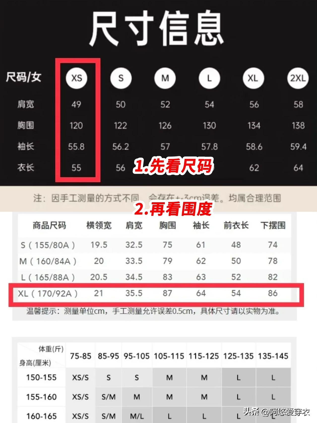 建議大家買衣服之前,先測量一下自己的三圍數據,再分析一下自己的身材類型,比如蘋果型身材、梨型身材、微胖身材,都不能直接看尺碼錶,得對照裏面的詳細數據,避免腰圍、臀圍、肩寬不合身的問題。