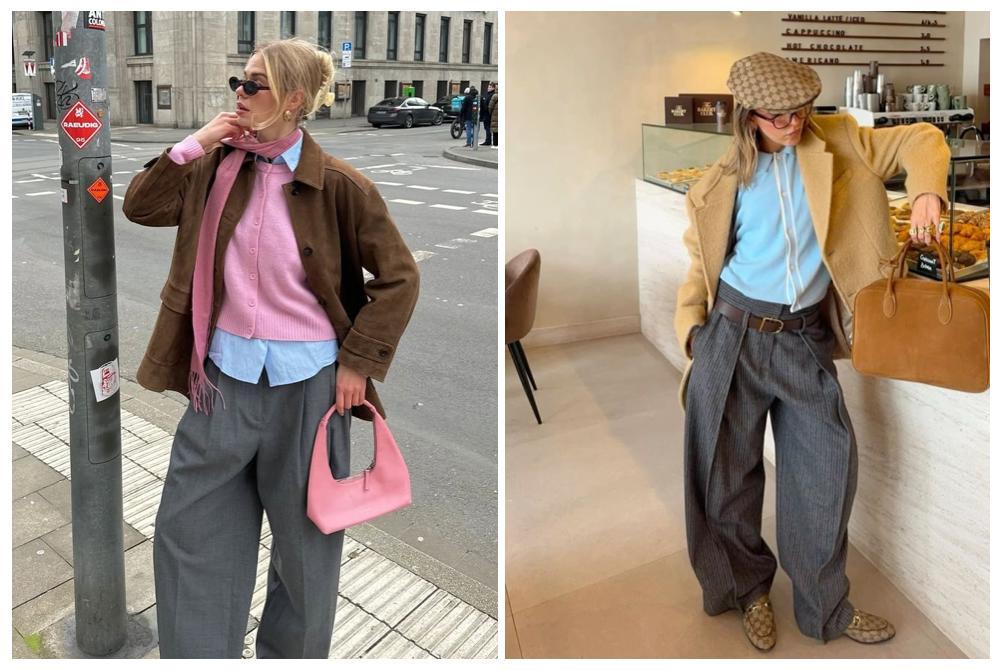 灰色西裝長褲寬鬆的褲管與微微拖地的長度,輕鬆爲造型塑造出如雕塑般的輪廓感和高級感。灰色的中性低調讓它成爲百搭基礎款,上身搭配一件亮色系的針織內搭,能瞬間打破灰色的沉靜,爲整體注入活力與呼吸感。