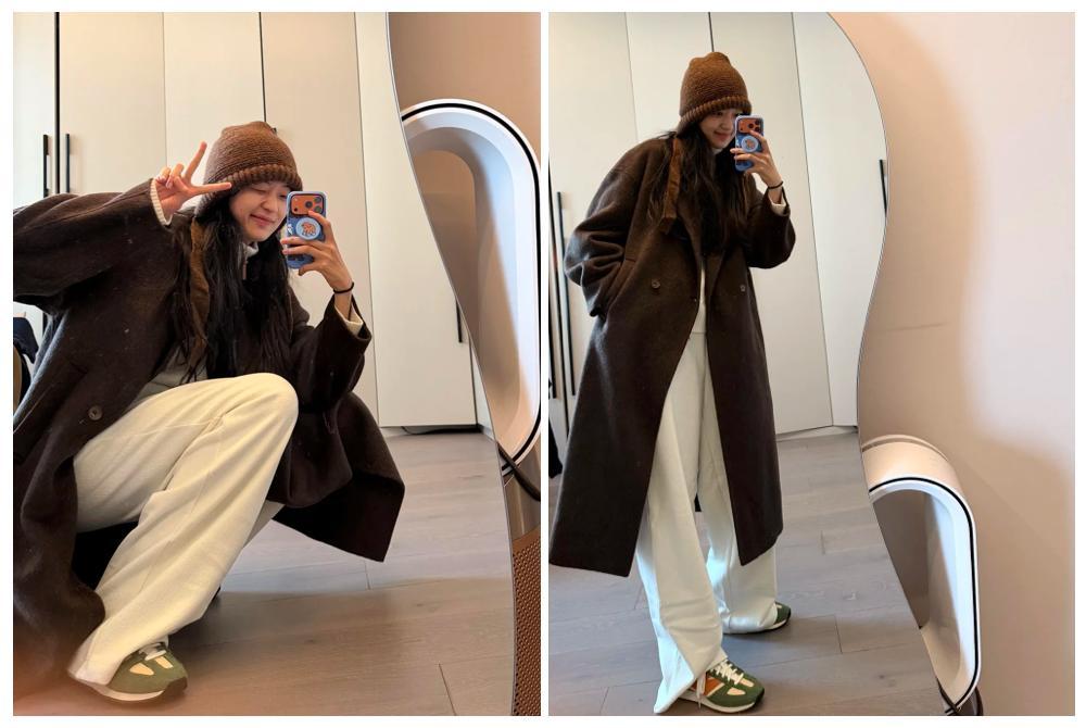 孫千這身很適合日常Softcore的穿着參考,乳白長褲以寬鬆剪裁構築舒適圈,鬆垮的褲腳讓造型的整體輪廓都顯得很舒適,堅挺的長款大衣穿上更是立刻帶來了一份鬆弛感,頭頂那頂針織帽更是像一杯冬日熱可可,軟糯又溫柔。