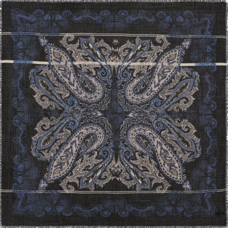這款月光方巾,靈感來自法國古老的開司米系列的萬花筒圖案,暗夜藍很有70年代的復古味道。