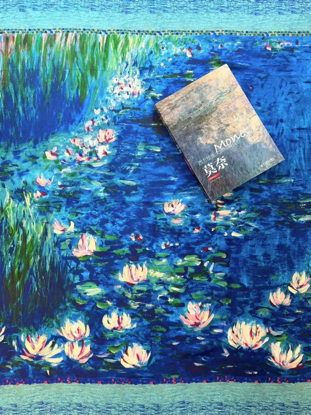 收到實物我就被驚豔了,重磅真絲手感順滑,濃郁純正的色彩好像打翻了調色盤。細看也是絕美,睡蓮的筆觸彷彿自帶立體效果,撞色鑲邊也有精美的細節。