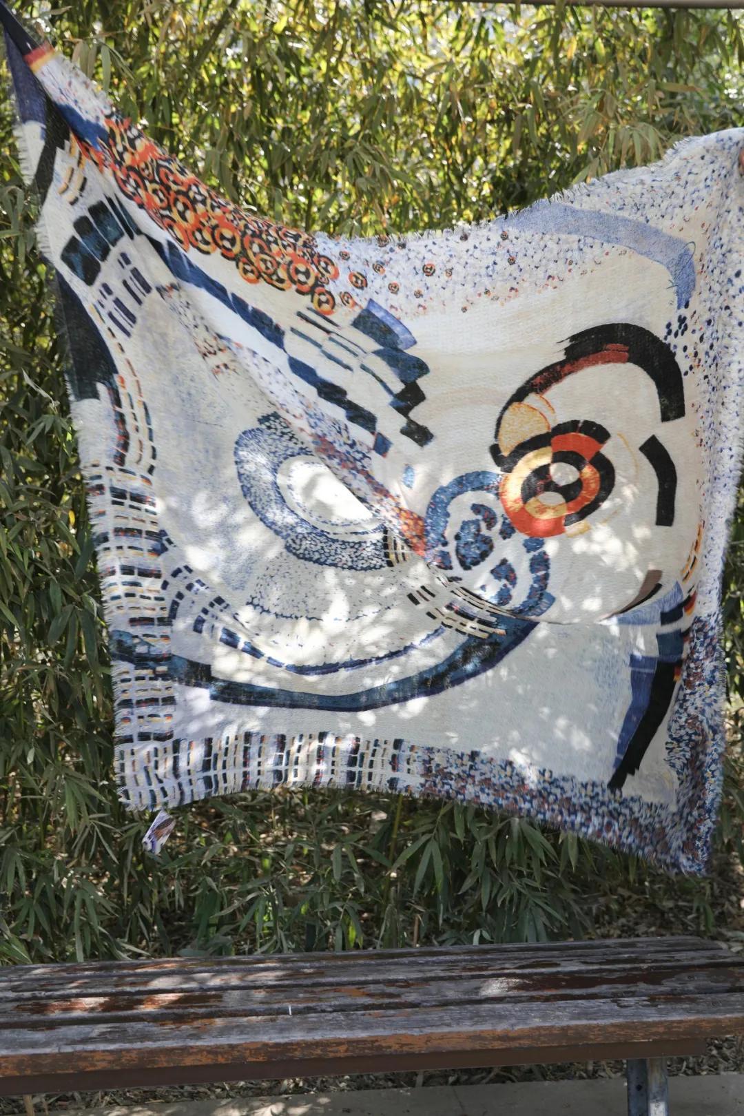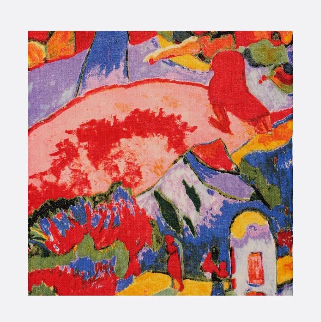圍巾也沿用了畫中大膽的配色,火焰般的樹木,燃燒着紅、橙和藍色,陽光般的黃色無處不在,如同綺麗自由的夢境一樣。