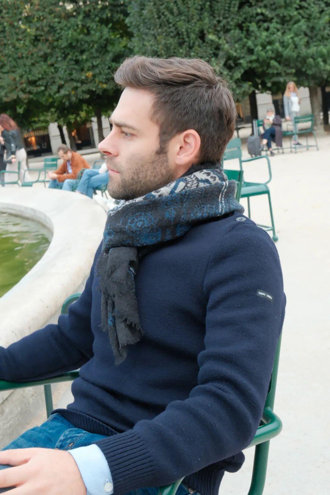 材質是絲毛混紡,羊毛與絲綢的結合帶來無比柔軟的包裹感,輕盈而溫暖,不易起皺。好友Bobo很喜歡這條,他說佩戴起來超級舒適。