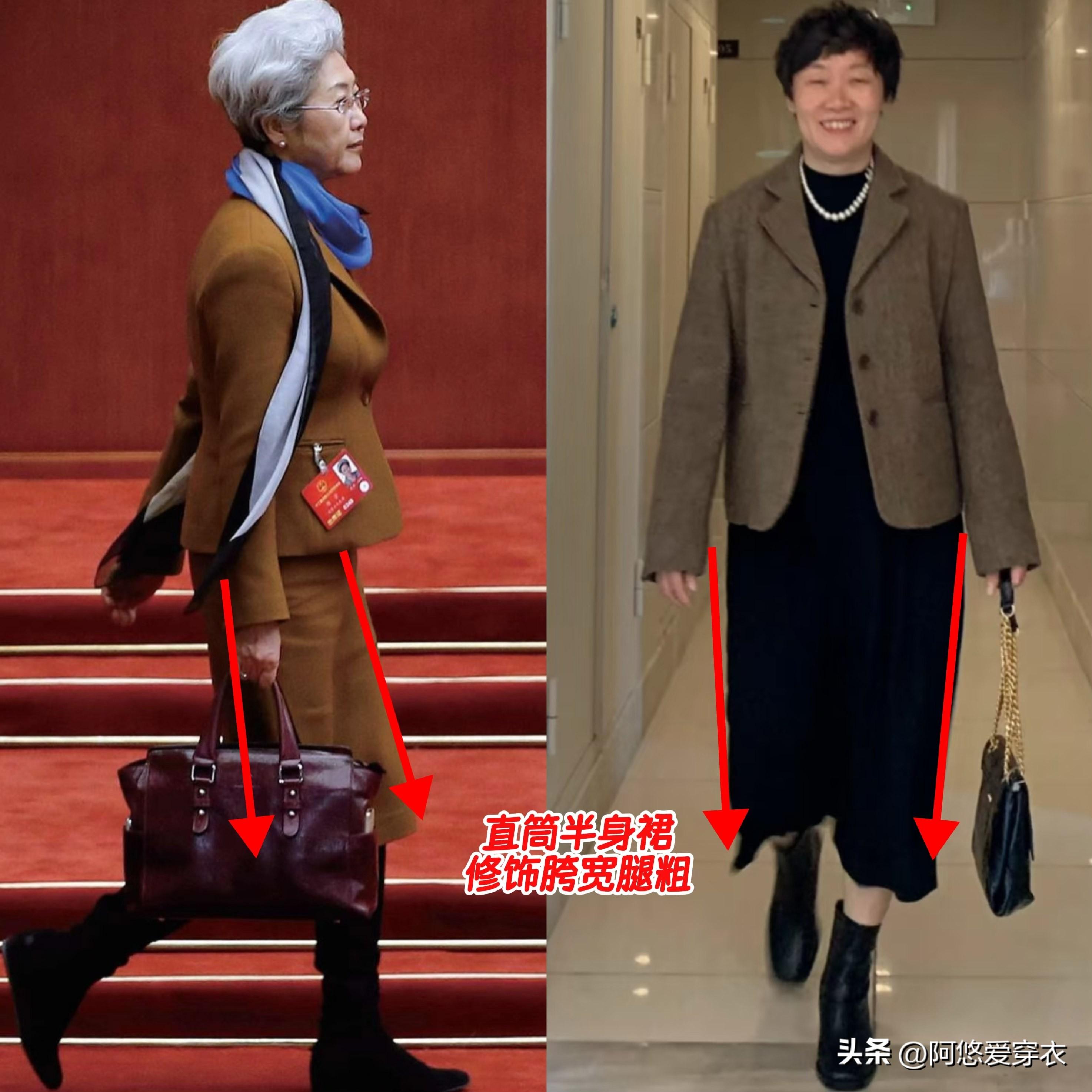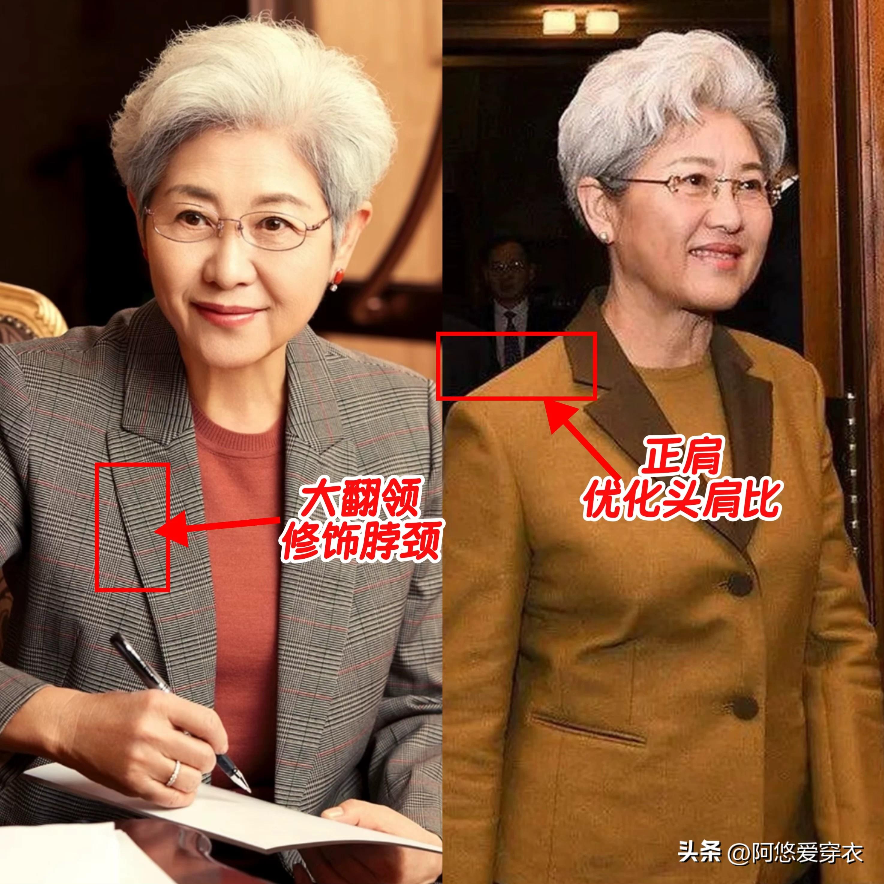 在正式的場合中,如果你想要穿出幹練的風格,那麼西裝外套也是必不可少的,你看傅瑩在很多的正式場合中,都喜歡穿正肩西裝,且加入大翻領的設計,有效地修飾了肩型和頸部,顯得頭肩比例特別好,發福的中年女人也有救了。