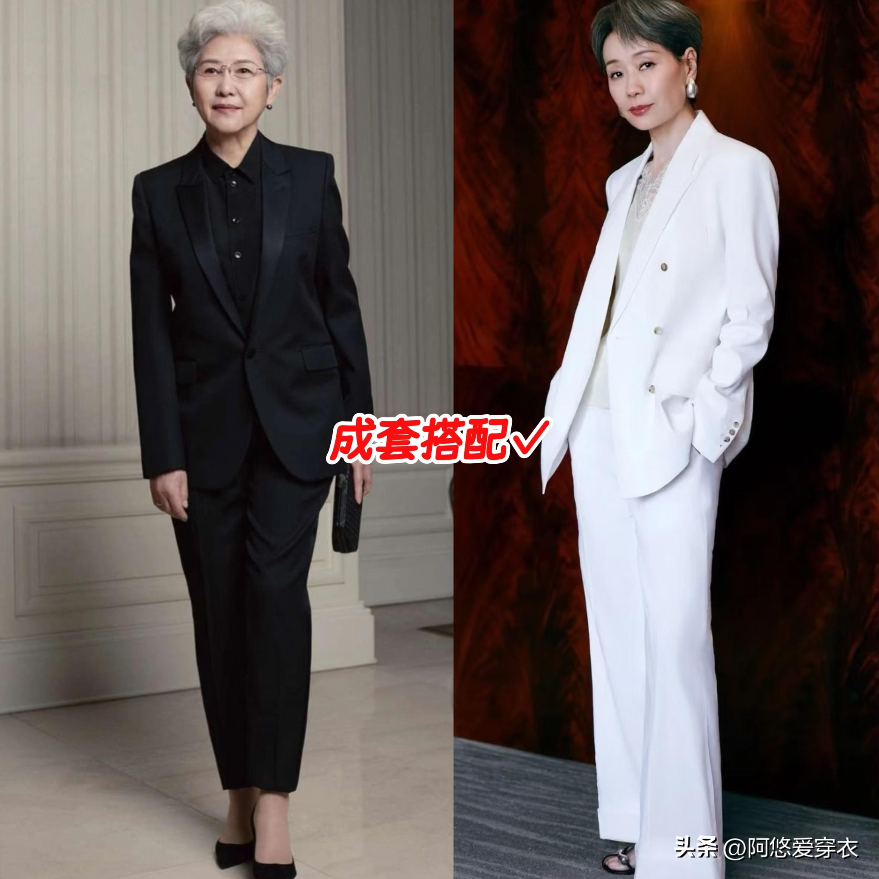 而且正肩西裝的打開方式特別多,參加一些重要活動的時候,我們可以直接選成套的西裝套裝,省時省力還顯氣質,幹練的不得了。顏色上推薦大家選經典的黑白色系,這類基礎色的成套搭配不容易踩雷,自帶高級感,且能順勢延長比例。