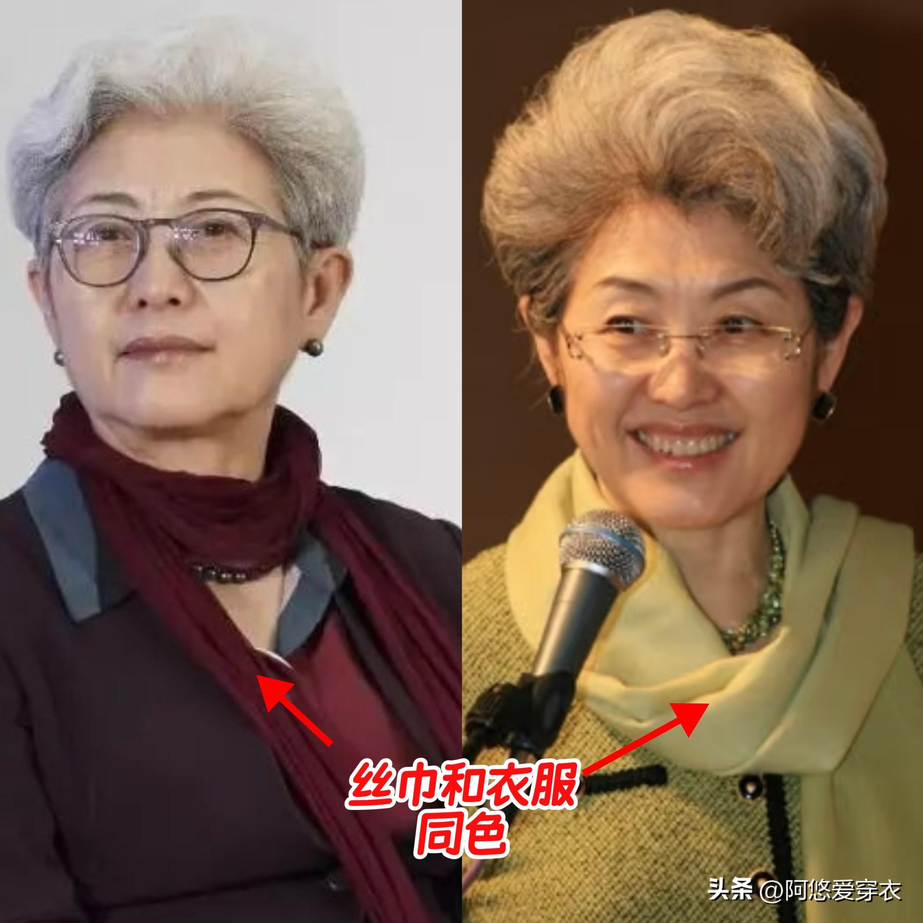 絲巾也是傅瑩很喜歡佩戴的一款配飾,但和大部分中年女人佩戴的絲巾不同,許多中國大媽喜歡佩戴大紅大紫的豔麗色絲巾,和穿搭產生衝突感,顯得特別油膩,傅瑩則比較偏愛和穿搭同色的絲巾,顏色飽和度適中,搭配起來更和諧。