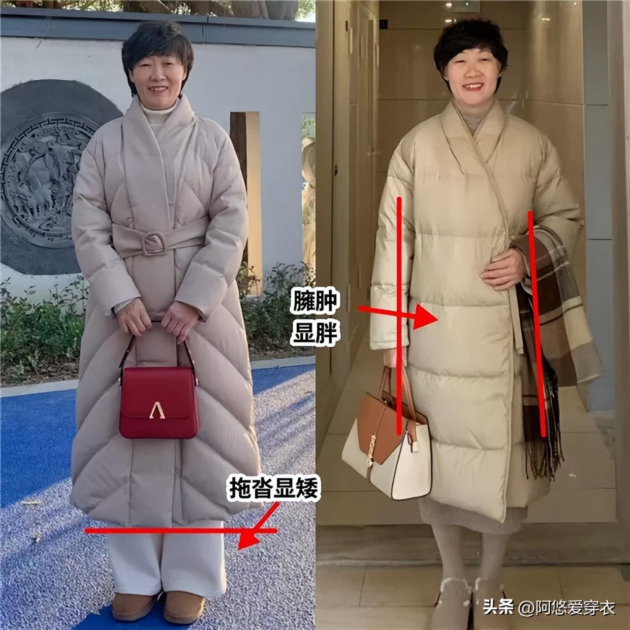 你看這些上年紀的阿姨們,本身身材就有點發福,再穿臃腫拖沓的羽絨服,把自己的身材包裹住就像是披着棉被出門一樣,直接顯胖一圈。