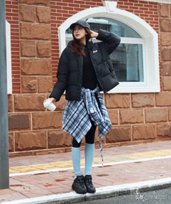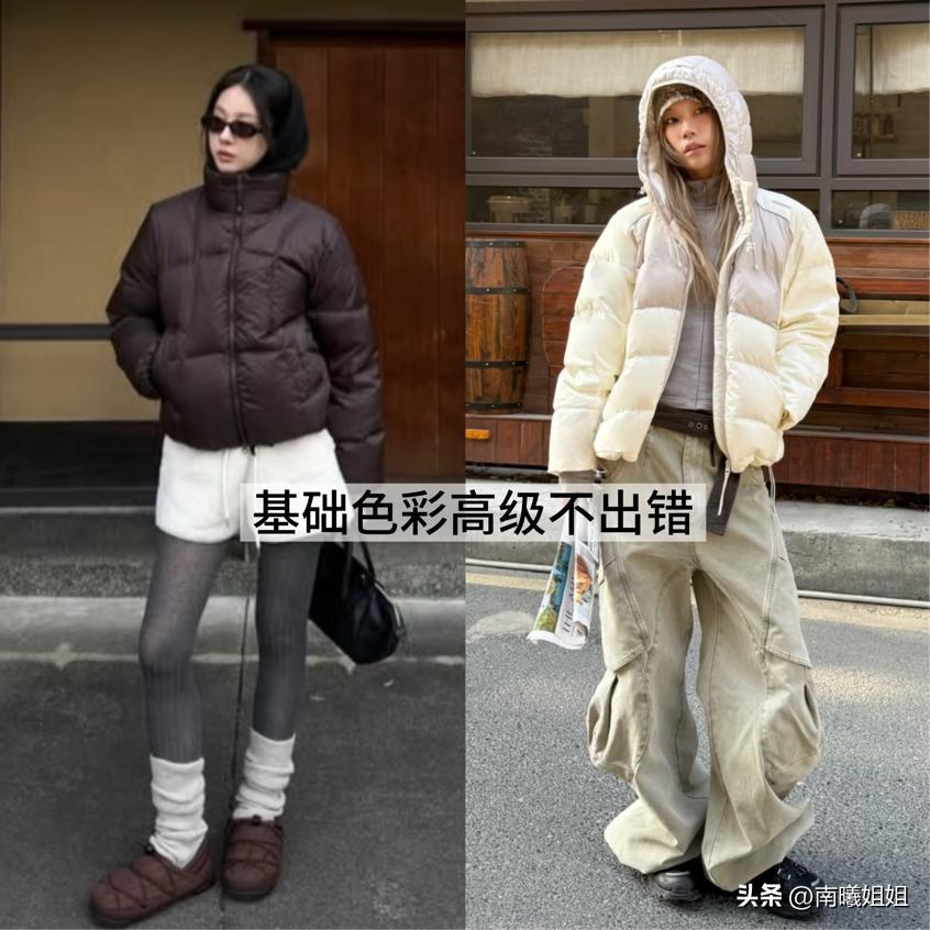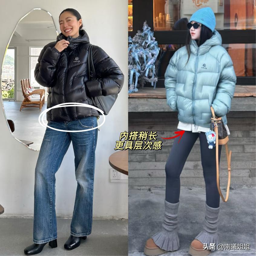 想要把羽絨服穿得時髦不臃腫,比例永遠是第一要義,而“長短疊穿”就是最實用的穿搭技巧。三里屯的潮人們深諳此道,他們會選擇短款的羽絨服作爲外層,長度剛好卡在腰線位置,能夠有效拉高腰線,優化身材比例。內層則搭配長款的針織衫或襯衫,下襬露出5-10釐米,形成“內長外短”的層次感,既能增加穿搭的豐富度,又能避免羽絨服的臃腫感。