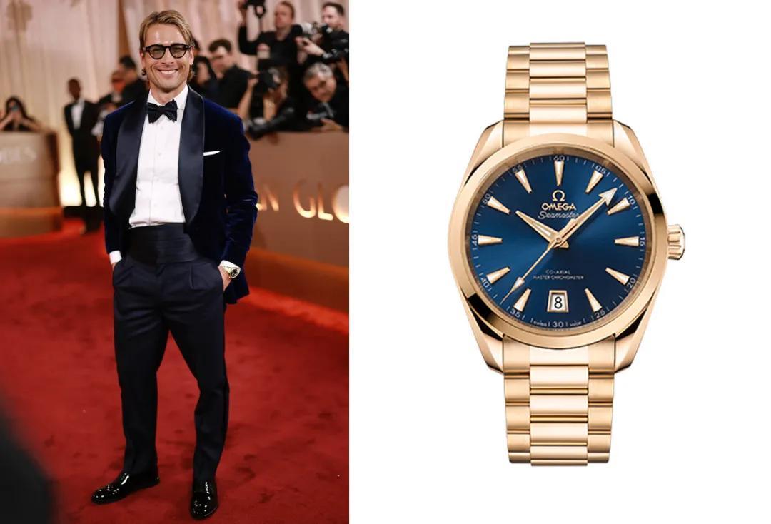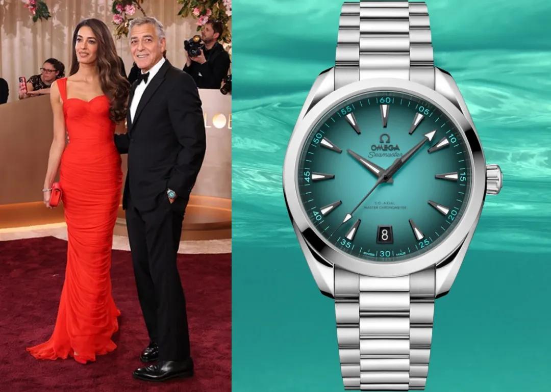 闊別10年迴歸金球獎的喬治·克魯尼,身穿經典阿瑪尼西裝,腕間也是歐米茄標誌性的海馬Aqua Terra腕錶 ,綠松石色錶盤別出心裁,滿滿新潮範兒。
