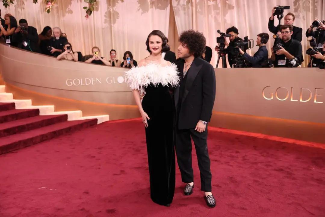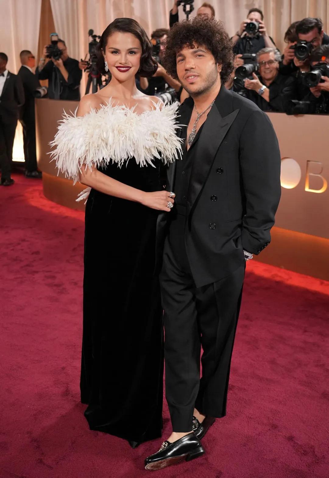 “傻臉娜”Selena Gomez瘦成一道閃電,身穿香奈兒定製天鵝絨禮服,領口的羽毛裝飾很有好萊塢黃金時代的復古名伶範兒,耗時323小時完成。