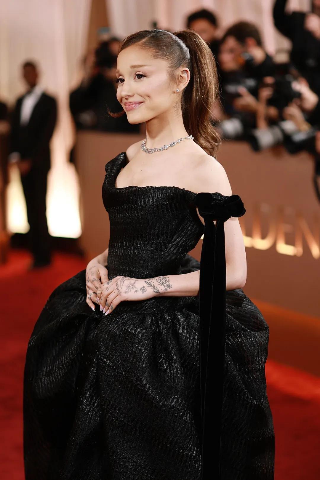 A妹Ariana Grande選了一件Vivienne Westwood定製禮服,標誌性緊身胸衣搭配巨大朋克風裙襬,彷彿一隻叛逆的黑天鵝。