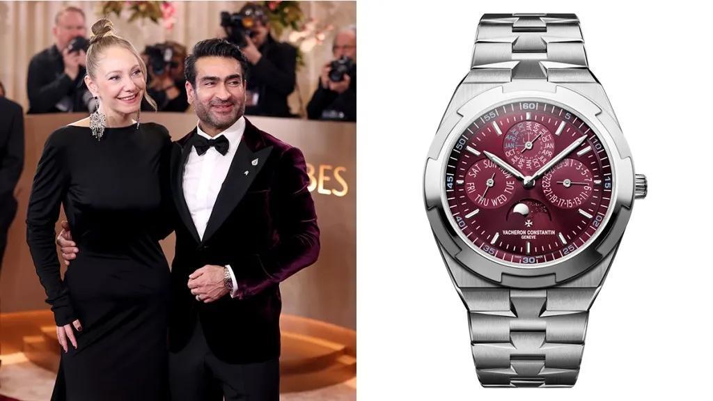 喜劇人Kumail Nanjiani身穿天鵝絨西裝,搭配江詩丹頓縱橫四海系列萬年曆超薄腕錶,白金材質搭配勃艮第紅盤,像一杯醇厚的紅酒,越品越香~
