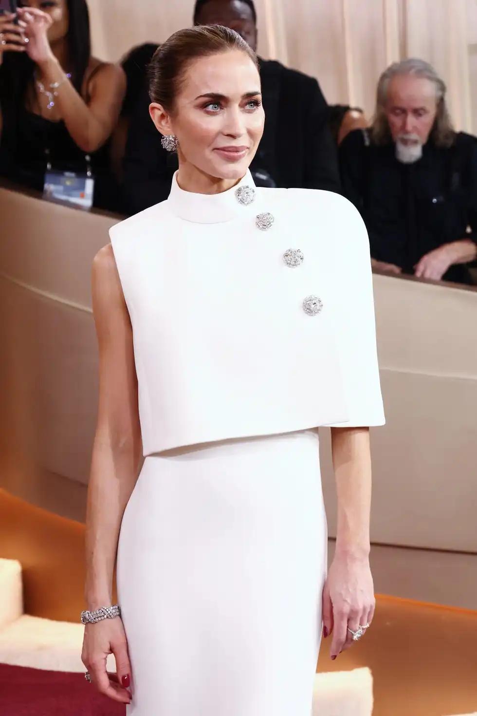 Emily Blunt穿LV白色禮服,同樣佩戴Tiffany珠寶。讓·史隆伯傑高級珠寶系列Poid耳環,以及1957年古董珠寶手鐲,十分復古典雅。