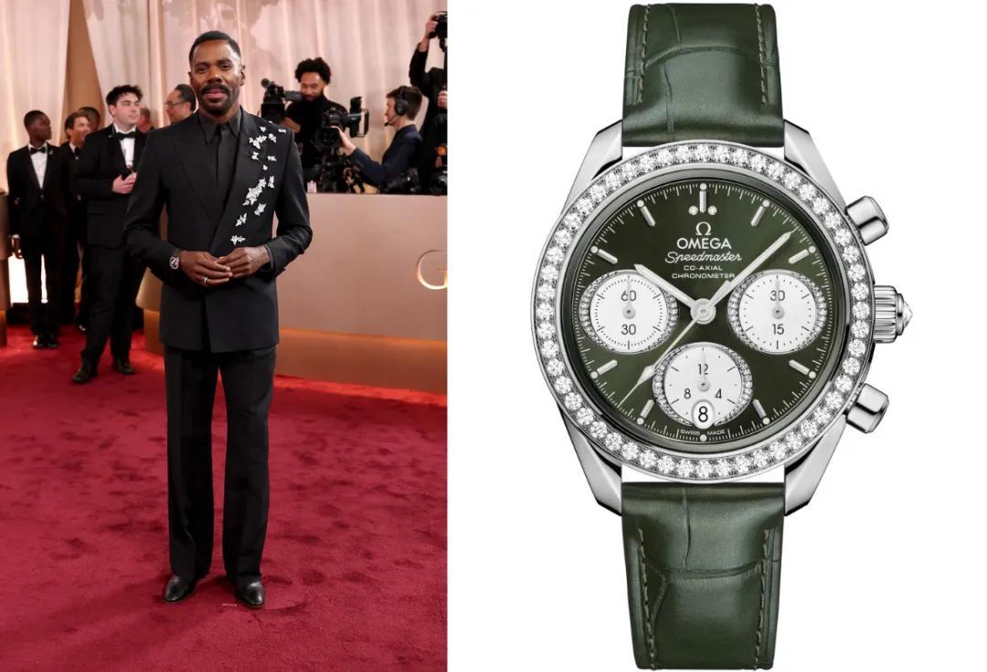 科爾曼·多明戈Pick了歐米茄Speedmaster 38,墨綠色盤面配鱷魚皮錶帶、鑽石表圈,精緻得像珠寶,跟Valentino西裝絕配。