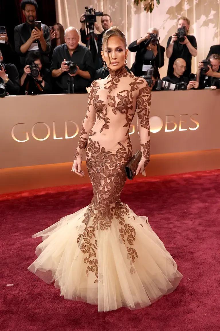 極致貼身的裸色設計,棕色的巴洛克風格刺繡蜿蜒全身,再加上一個蓬蓬紗魚尾下襬,勾勒出完美曲線。搭配Sabyasachi高級珠寶,那種撲面而來的“富貴感”,真的很JLo。
