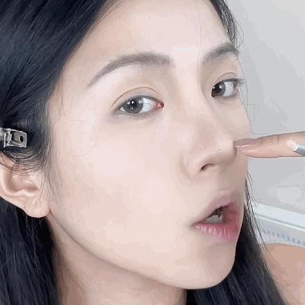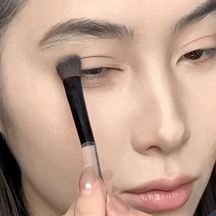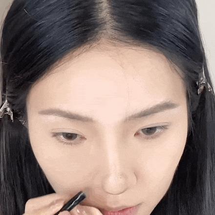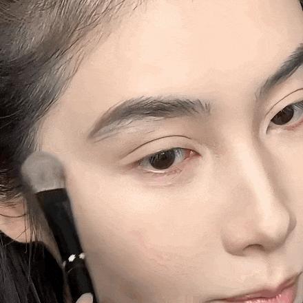準備一把小斜頭刷,蘸取灰調鼻影色,從眼珠正上方的眉部位置起筆,向前勾勒出流暢的C形線條,直至眼角正前方收尾,最後用乾淨刷子輕輕暈染邊緣,讓陰影與皮膚自然融合,打造原生高鼻樑輪廓。
