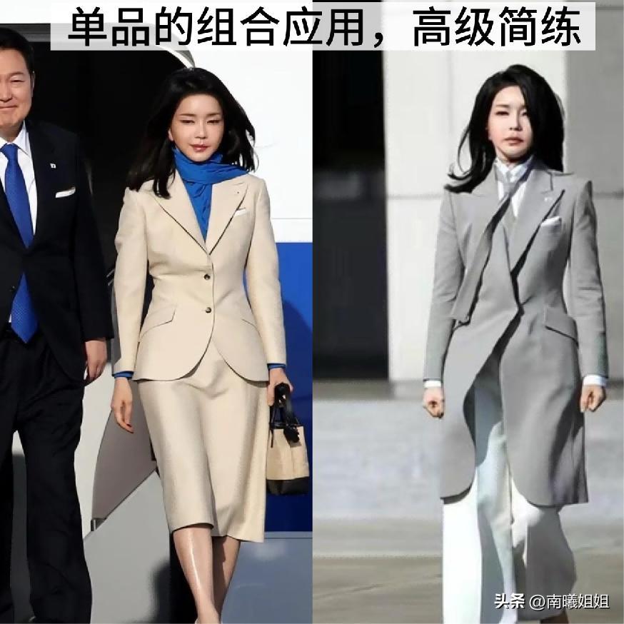 如果不知道組合怎麼樣進行搭配,那麼大家可以學一下第一夫人金建希,多多的去運用一些直筒且能夠凸顯出高級感的設計款式來進行組合,不管是上下還是進行疊穿,整體的穩定和高級,沉穩、利落的效應是非常明顯的。