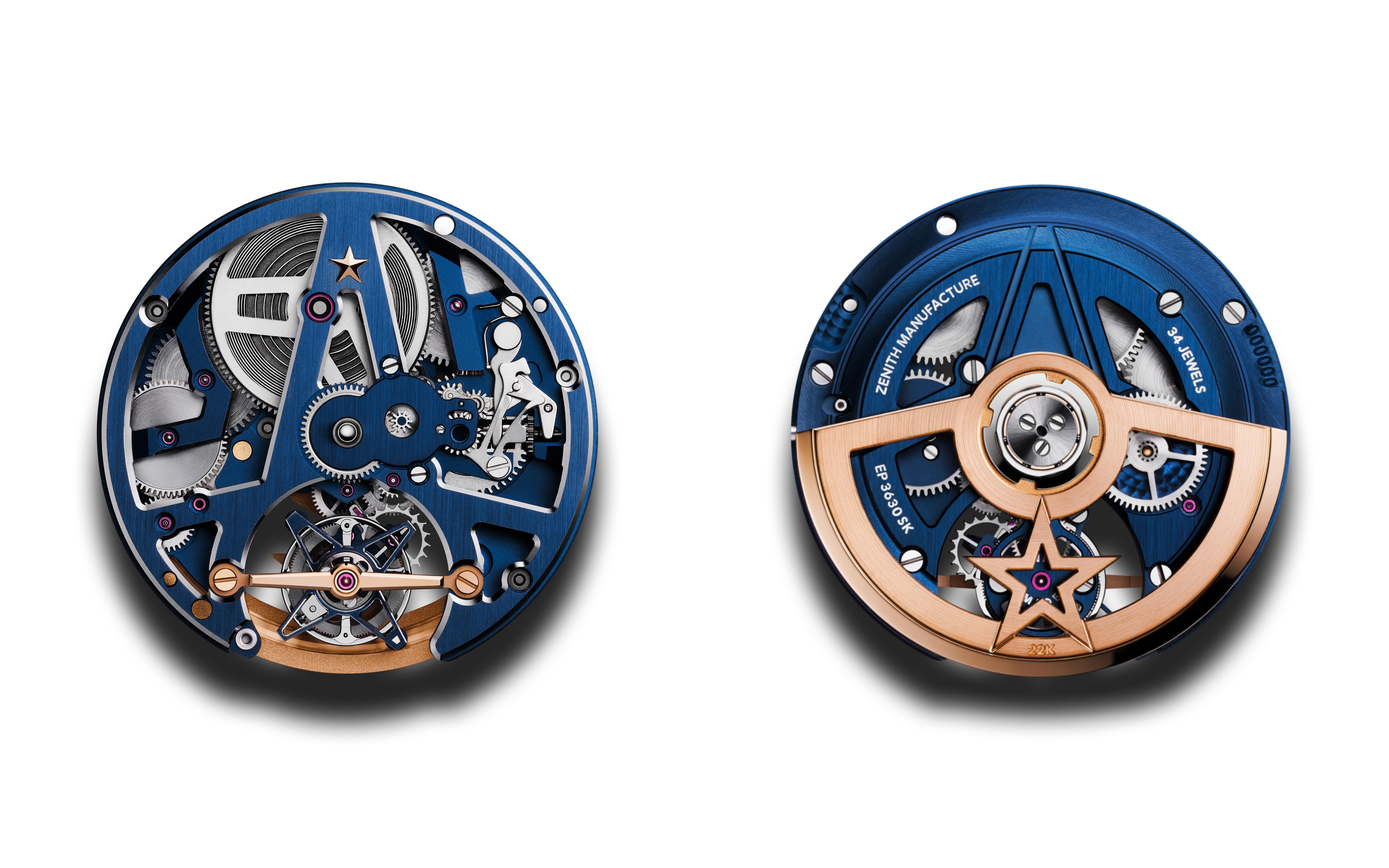 腕錶搭載El Primero 3630 SK型自動上鍊機芯,呈現濃郁而明亮的藍色調。其鏤空設計以品牌標誌性的星形作爲結構主題,並以陀飛輪爲中心向外伸展。機芯巧妙展現了對比鮮明的層次深度、修飾工藝與色彩,位於10時與2時位置的兩道建築風格橋板以其精妙結構注入靈動韻律。其採用雙層傾斜幾何設計結構,營造不斷變幻的立體效果,與當代建築的線條與懸挑結構相呼應。