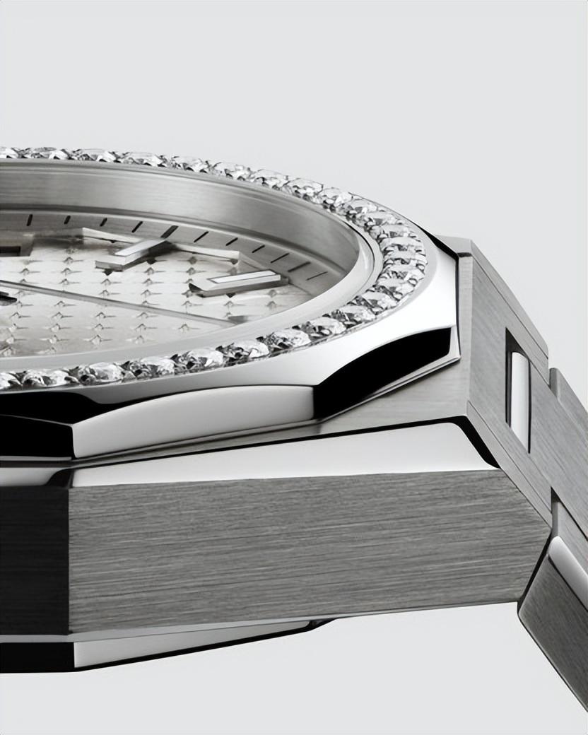 這款腕錶的36毫米刻面精鋼錶殼線條銳利、輪廓分明,令人聯想到現代都市景觀,並提供十二邊型表圈鑲嵌明亮式切割鑽石或無鑽款式兩種選擇。其旋入式錶冠確保防水深度達10 ATM(100米),巧妙平衡了精煉美學與日常實用需求。
