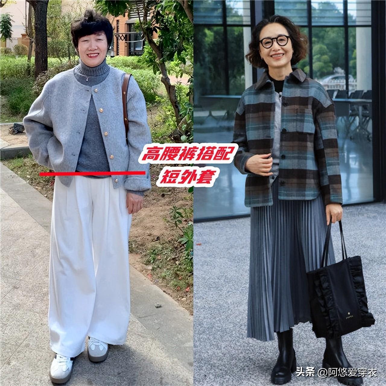 前面提到了,身材比例一般的中年女人適合穿短外套,但僅僅依靠短外套還是不夠的,下半身還得搭配高腰的下裝,拉高我們的腰線纔是王道,同時可以配一雙帶跟的鞋子,能視覺上增高,比穿平底鞋更顯氣質。上年紀的阿姨如果不擅長穿高跟鞋,可以選3cm左右的鞋跟,舒適和增高平衡的剛剛好。