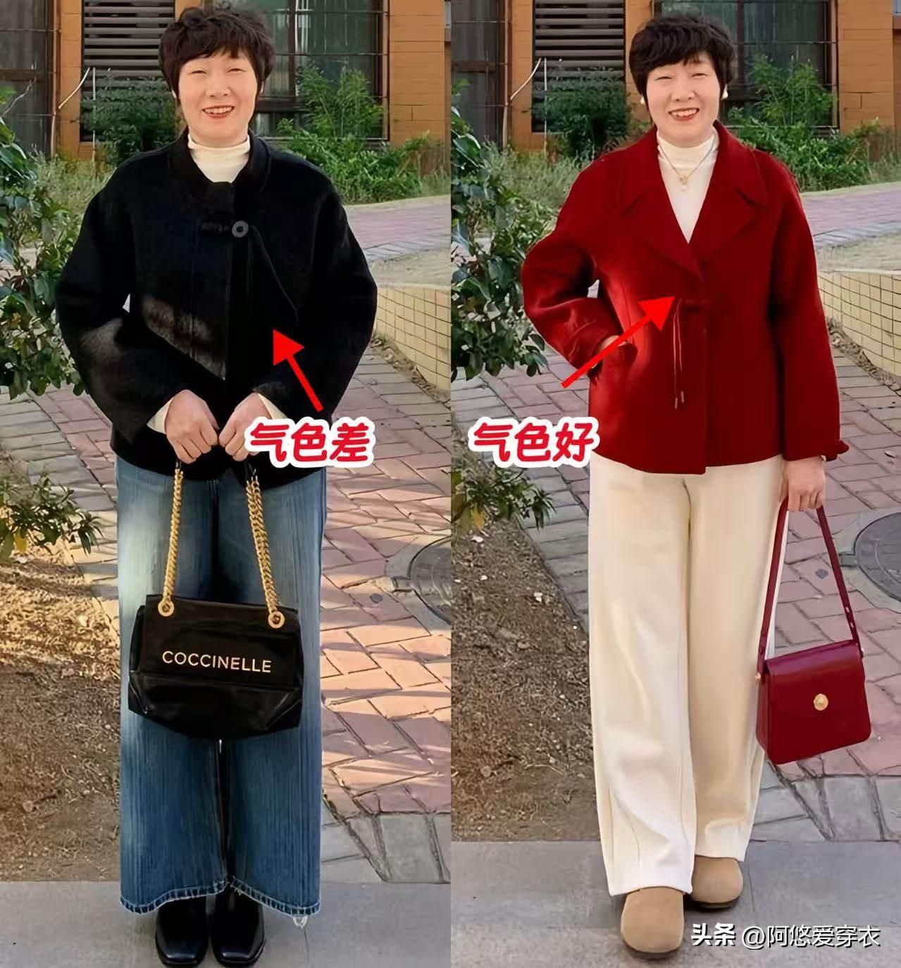 冬季的外套款式很多,看到各種款式和各種花色,中年女人難免會感到糾結,咱們第一步就從選顏色開始吧,比如很多中年女人的皮膚暗沉,氣色差,選外套的時候或許可以看看中高亮度的款式,推薦下面這種紅色的外套,既能提亮我們的皮膚,還自帶氛圍感,過年的時候走親訪友都特別的有氣場。