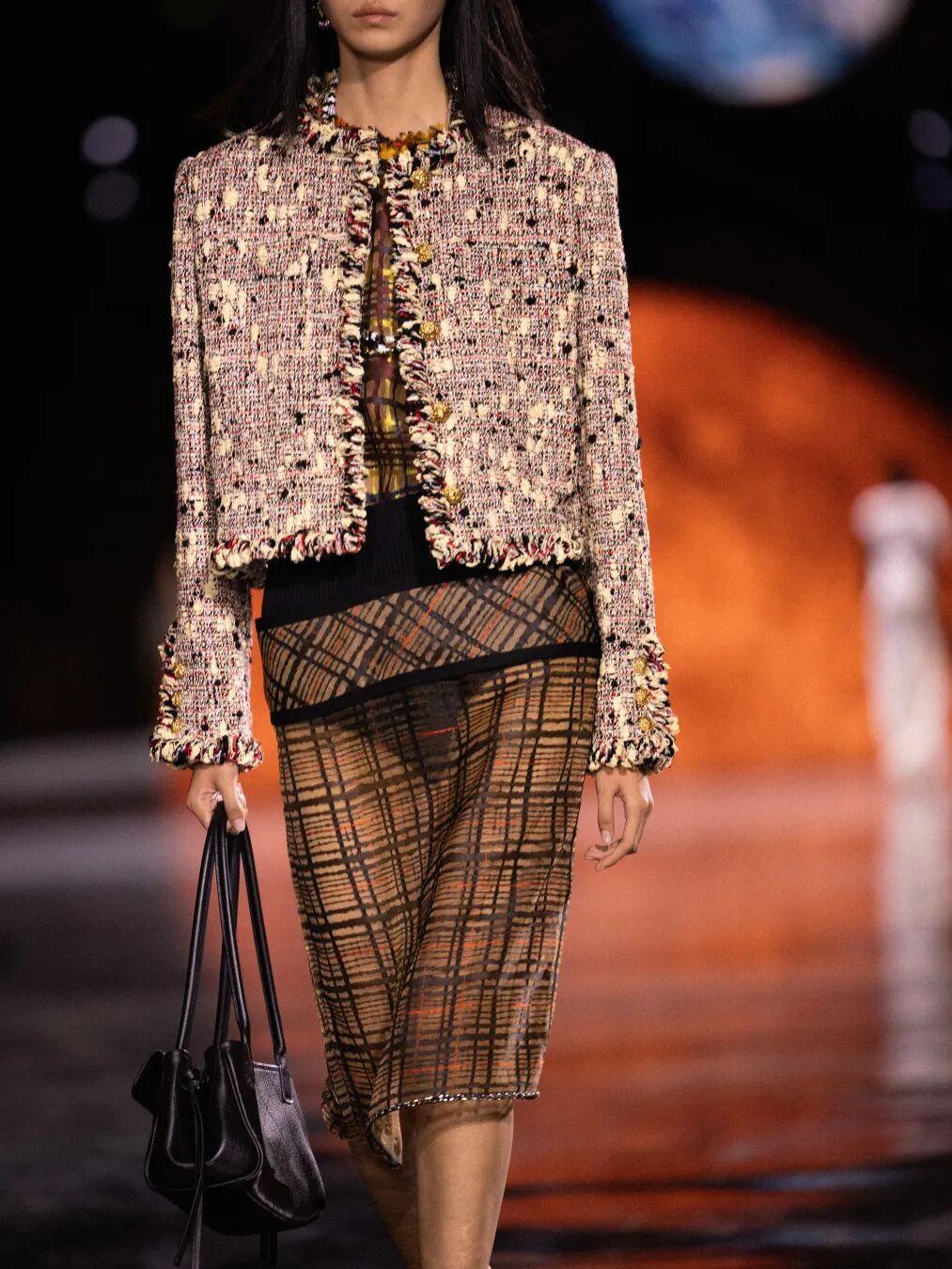 當需要描繪一位身着Chanel的女性形象時,斜紋軟呢套裝絕對是最爲濃墨重彩的象徵。但在Blazy手中,正如他曾經用牛皮僞裝成牛仔褲與法蘭絨襯衫等單品,這款經典的作品也在秀場的後半段,以他標誌性的實驗性視角進行重構。黑白珍珠的密佈與堆砌、縐紗般透明面料上繪製縱橫交錯的線條、鏤空針織形式的擬態……斜紋軟呢套裝這一品牌服裝形象中最爲經典的符號之一,以多種多樣的形式進行復現,營造出具藝術般的氛圍之外,也增添了現代性。