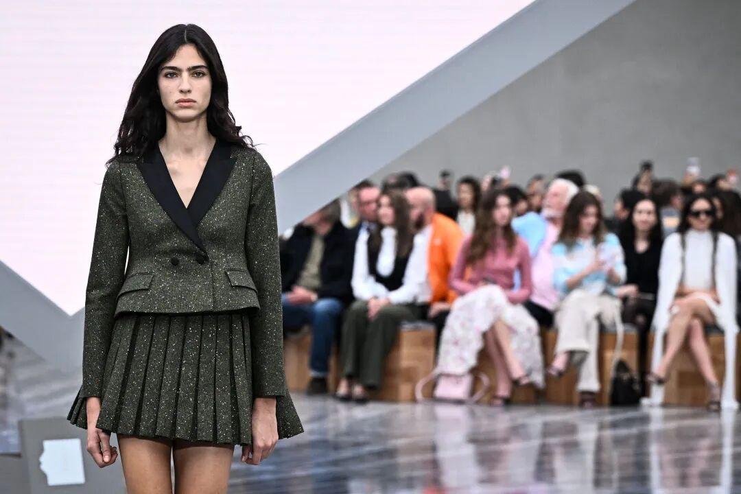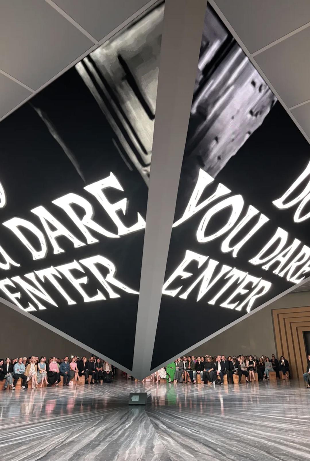 在巴黎當地時間10月1日下午2點半的杜樂麗花園,所有人都屏息以待,想要看到這位執掌Dior女裝的第8位設計師所帶來的新形象。在時裝秀正式開始前,秀場中央,那猶如盧浮宮地下中央倒金字塔般的裝置開始播放影片。銀幕以一種希區柯克驚悚片的形式寫出:“Do you dare enter the house of Dior?(你有膽量加入Dior嗎?)”之後,從創始人Christian Dior先生,到後續的各位創意總監的秀場高光與幕後花絮,皆以蒙太奇方式的形式融合在一起。