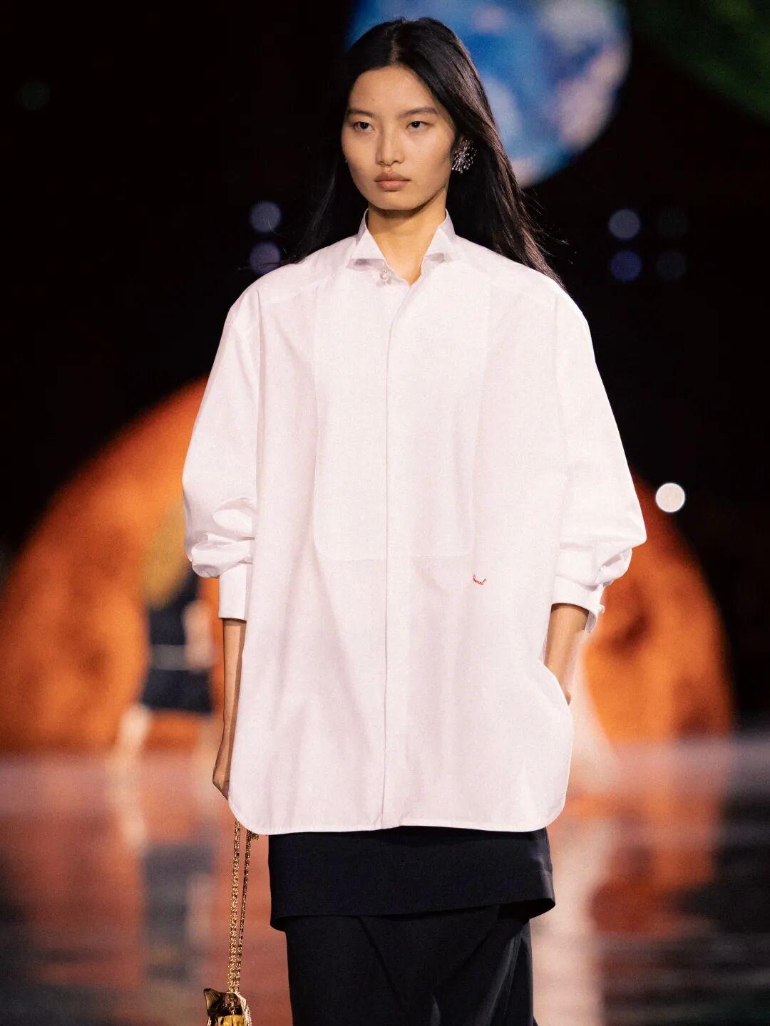 花朵貫穿着整個系列,以抽象的形式,呈現一種放射狀來營造出熱烈的模樣。它們點綴於耳畔,或密佈在裙襬之上,伴隨着模特們的步伐,變得更爲流動,更加盛放。而男裝元素的出現,似乎也是Boy Chapel影子的映照。簡潔利落的襯衫,是旺多姆廣場中歷史悠久的制襯世家Charvet與品牌的合作成果。在保持直筒、紐扣在右等男裝服飾結構之外,在襯衫內部下襬處增添了經典的鏈條滾邊,多了一絲經典的印記的同時,也營造了服帖與垂墜。