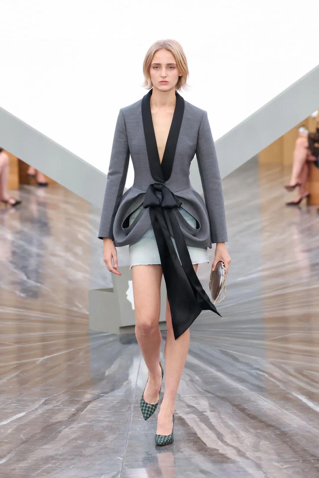 圖片均爲Dior 2026春夏女裝成衣系列。除了將經典的Bar Jacket進行再造之外,可以看到Jonthan Anderson也將Yves Saint Laurent與John Galliano等前任創意總監塑造的形象融入首秀的靈感板,並結合自身的美學風格進行創作。