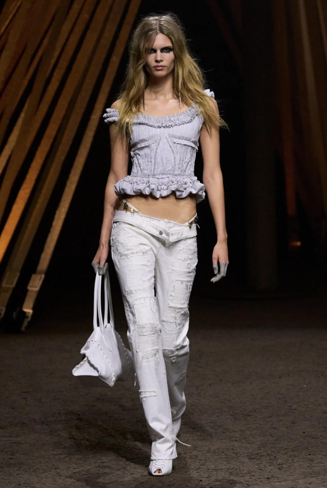 在McQueen 2026春夏系列中,McGirr以電影《異教徒》(1973)作爲靈感來源,將關於內心的慾望的壓抑與釋放作爲起點。這部帶着些許邪典意味的電影與品牌歷史中那些關於創傷、暴力與黑暗的主題有着些許關聯。McGirr將切割的元素運用在系列中,呼應着電影中制服被拆解並回歸天性的內容。因此衣服也因爲切割露出了更多的身體線條,尤其是腰部。同時,McGirr也將曾經引發爭議的Bumster牛仔褲重新帶來秀場之上,同樣的還有曾在2003年推出的角形高跟鞋。整體上,McGirr打造的是更加實穿與街頭的造型,但無論是從主題出發還是重新對檔案的運用,也變得更加和諧,讓整個系列更加統一與流暢,因此也收穫了不少好評。
