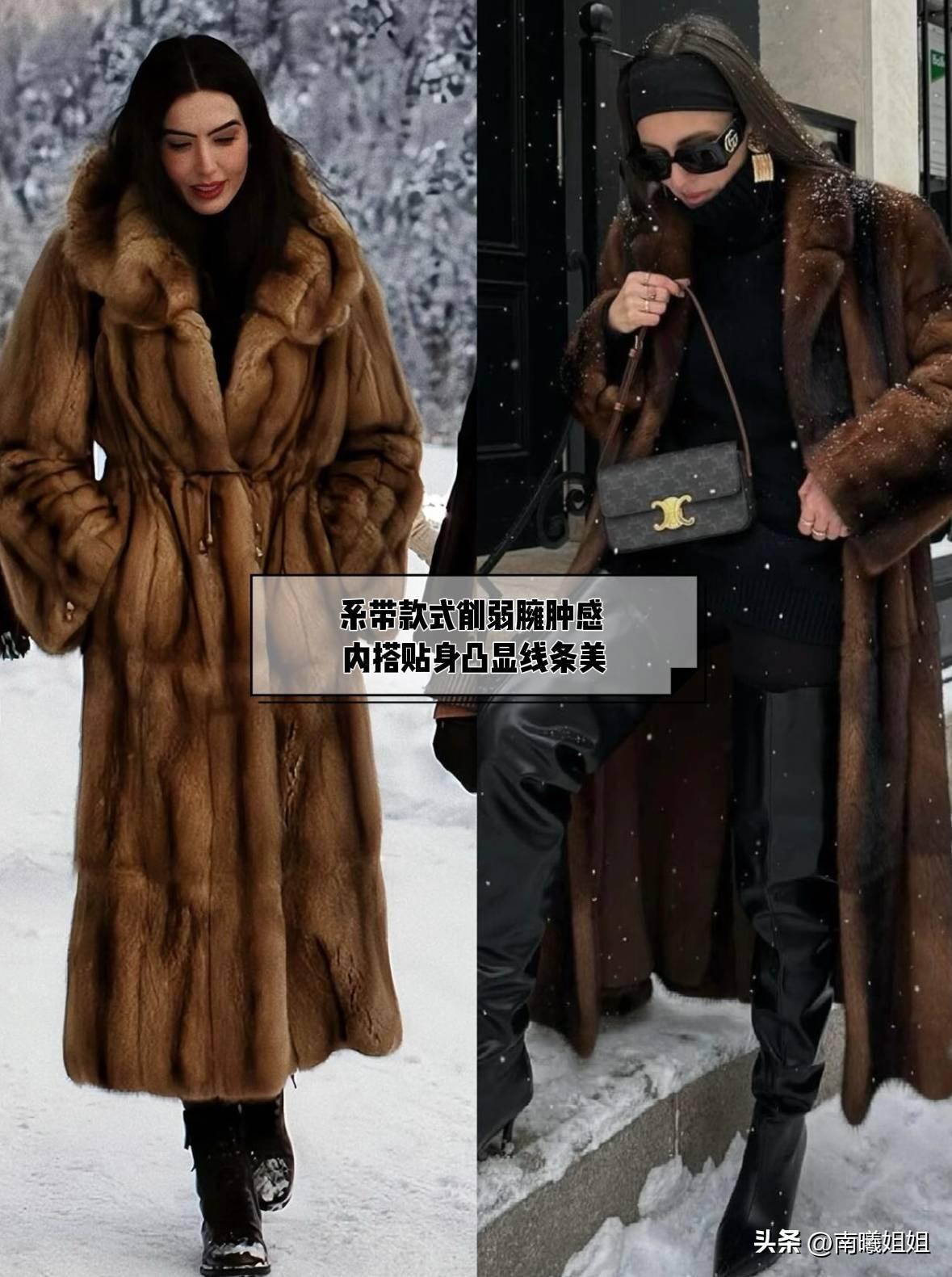 收腰款式的長款皮草外套,腰線收緊的那一刻,就能打破膨脹感,內搭修身款式的毛衣,貼合身形曲線,凸顯線條美,搭配一雙低跟款的長靴,優選啞光牛皮或麂皮,可以中和皮草的光澤度,高級感拉滿。