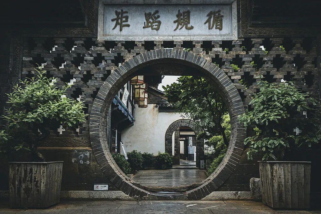 在有着“滇南大觀園”之稱的朱家花園中,一進大門便可以看到寫着朱家家訓“循規蹈矩”的月宮門。