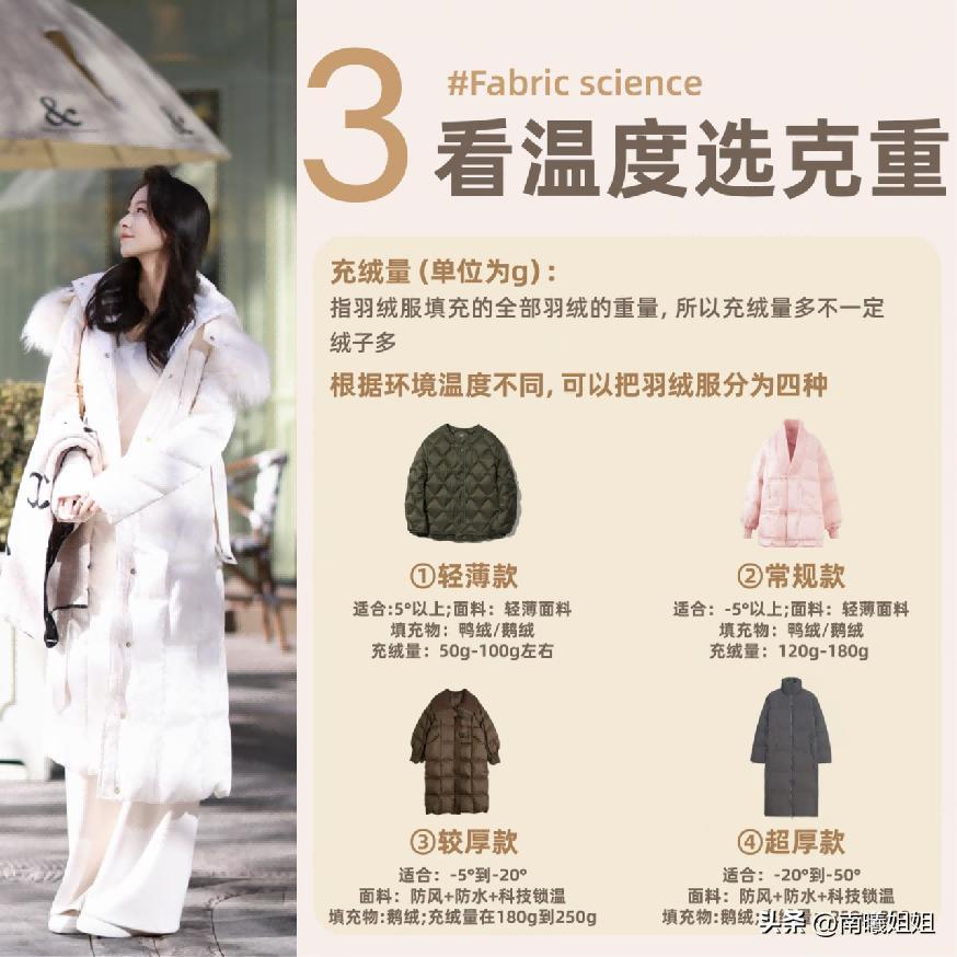 第2個我們要看的指標就是你所搭配的羽絨服,它的充絨量以及充絨的比例是如何的,第1點的話,我們就是根據你所運用的羽絨服的款式來進行考慮的。短款羽絨服以及常規的長款設計,還有就是麪包服以及長款的羽絨服,這一類在不同的城市當中,他們的搭配頻率和受歡迎程度都是不一樣的,所以以上的那一組表格,我們還是要以這樣的從容標準爲主。