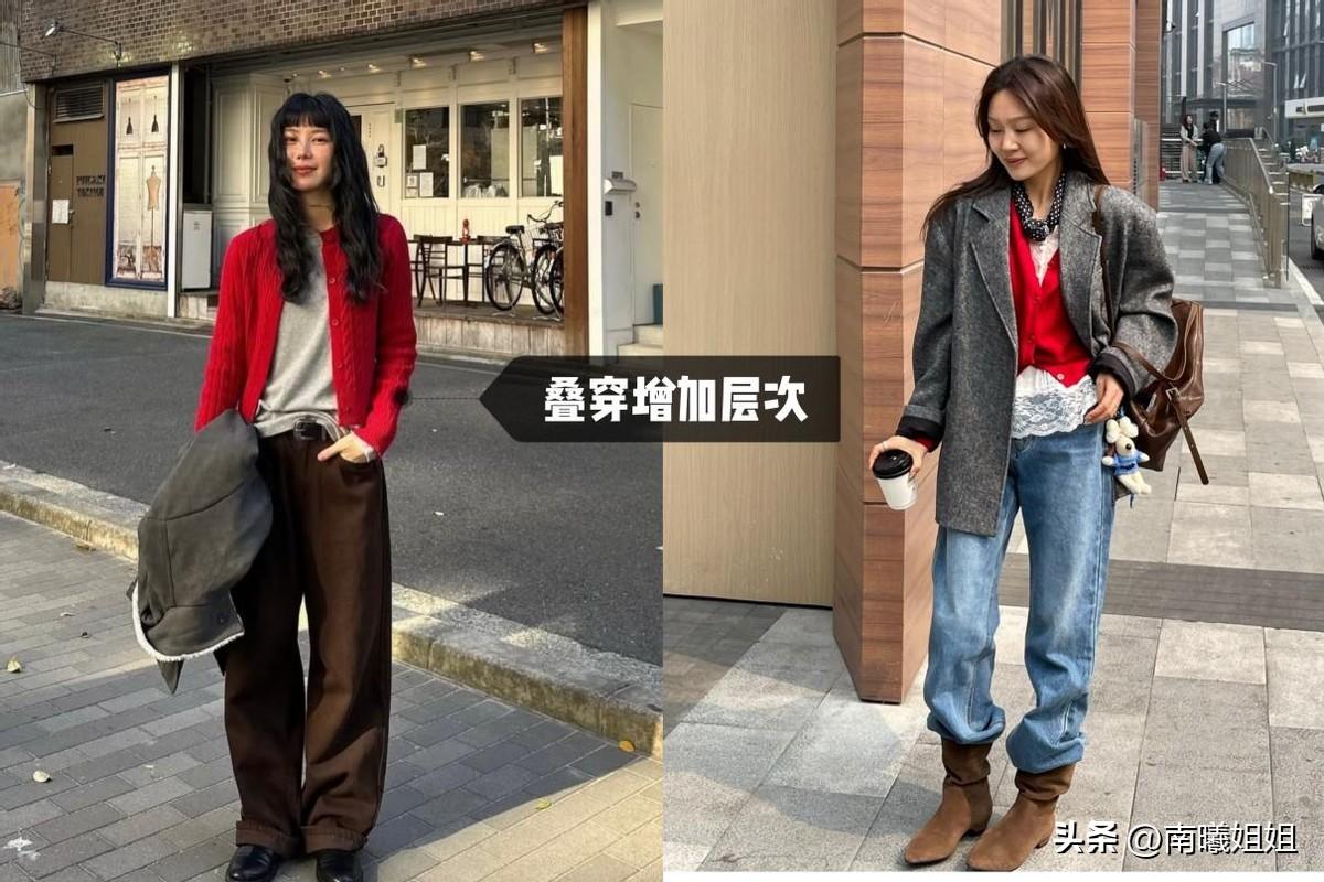 選擇一件基礎款的毛衣開衫,疊搭西裝、大衣、羽絨服,紅色和基礎色的碰撞,立馬就能形成互補關係,踩雙短靴,既能打破沉悶,又可以突出個人辨識度。