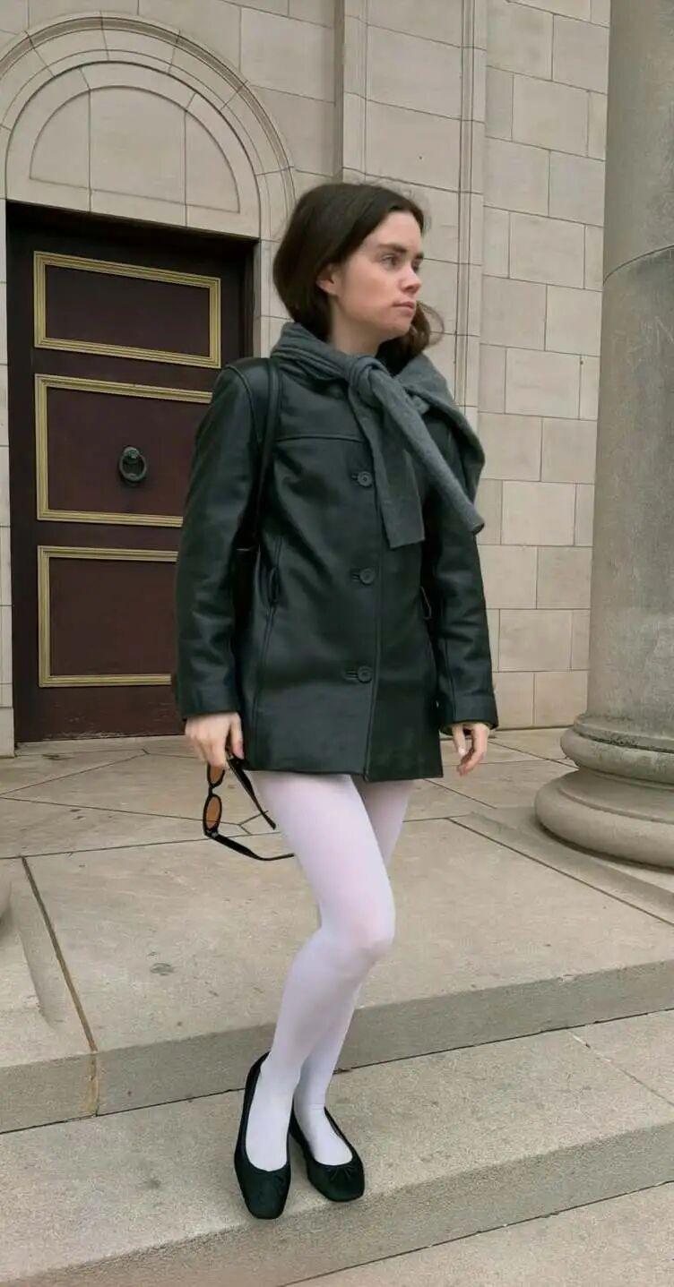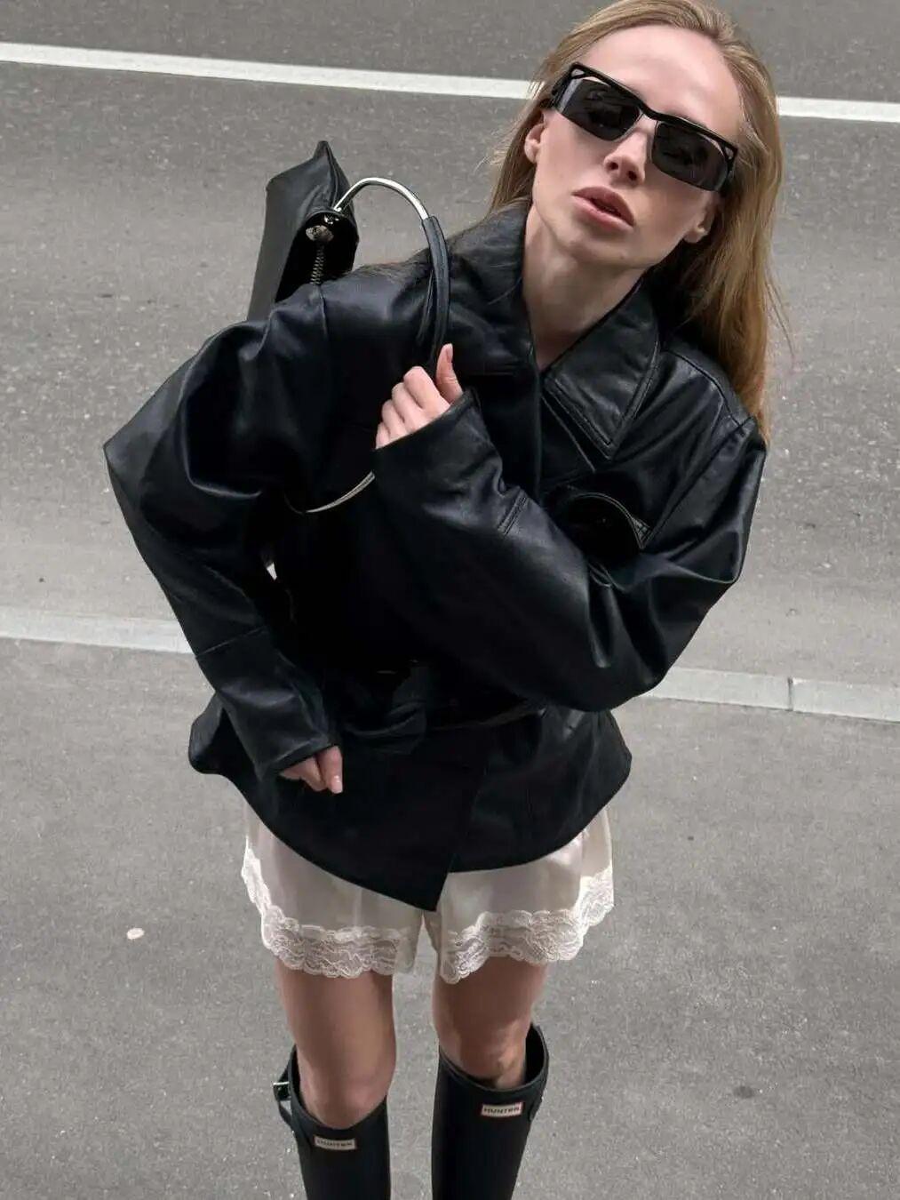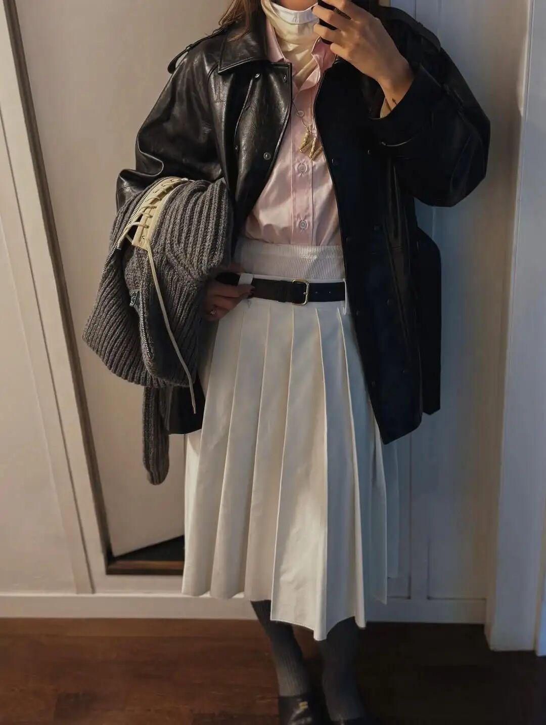 你也可以用現有衣櫥搭配出Miu系皮衣的穿搭方式:皮衣+學院感半身裙,更有青春的氣息。