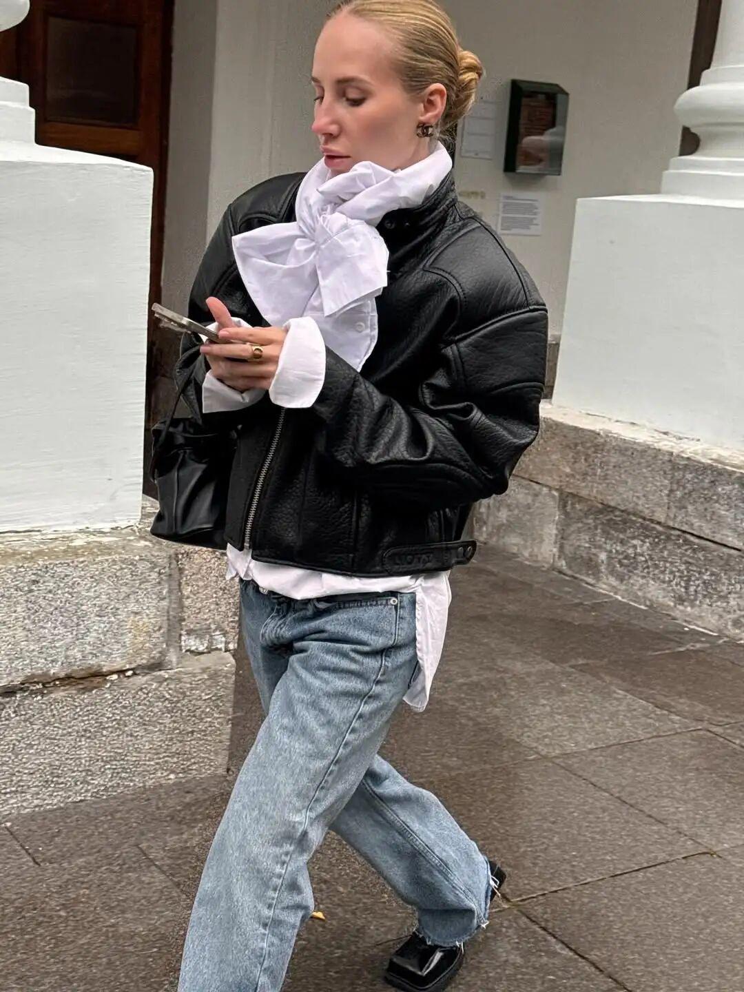 我們在秋冬中總是很難將白褲子融入整體造型,但偏偏和白色牛仔褲最有衝突感的皮衣,可以組合成最佳CP。
