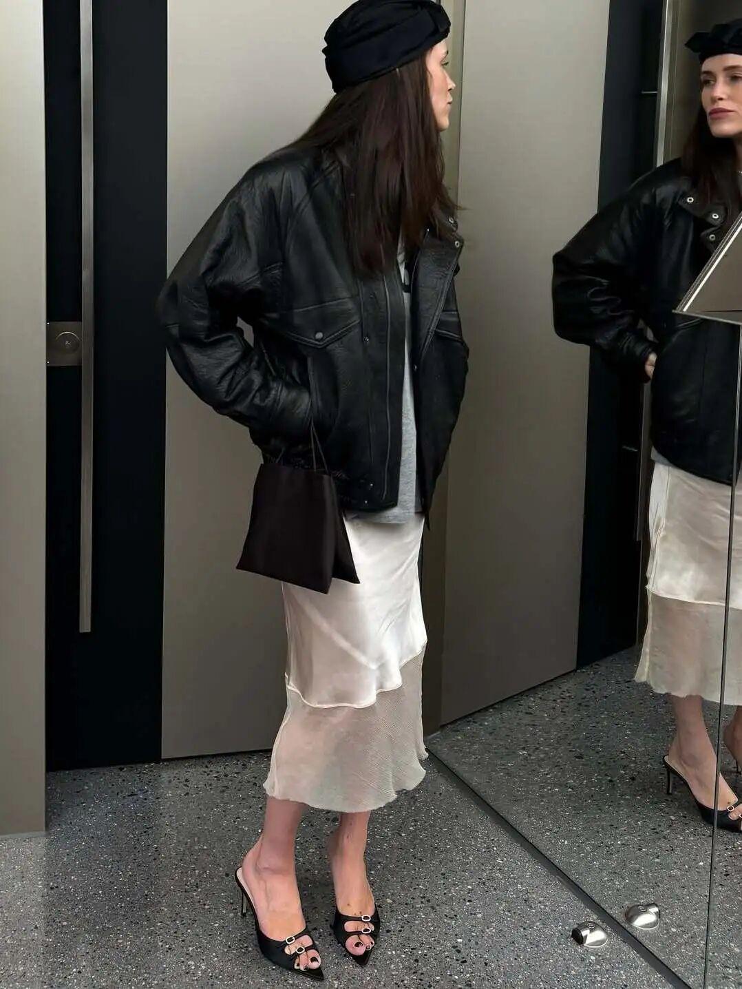 硬朗的皮衣搭配具有反差感的女性氣質單品,是最平衡的穿搭選擇。內搭綢緞襯衫的同時小露Bra,及保持了露膚度,又中和了皮衣太過tough的感覺。在搭配時,不選擇常規的黑色絲襪,而用更具少女氣息的白色絲襪是高階玩法。