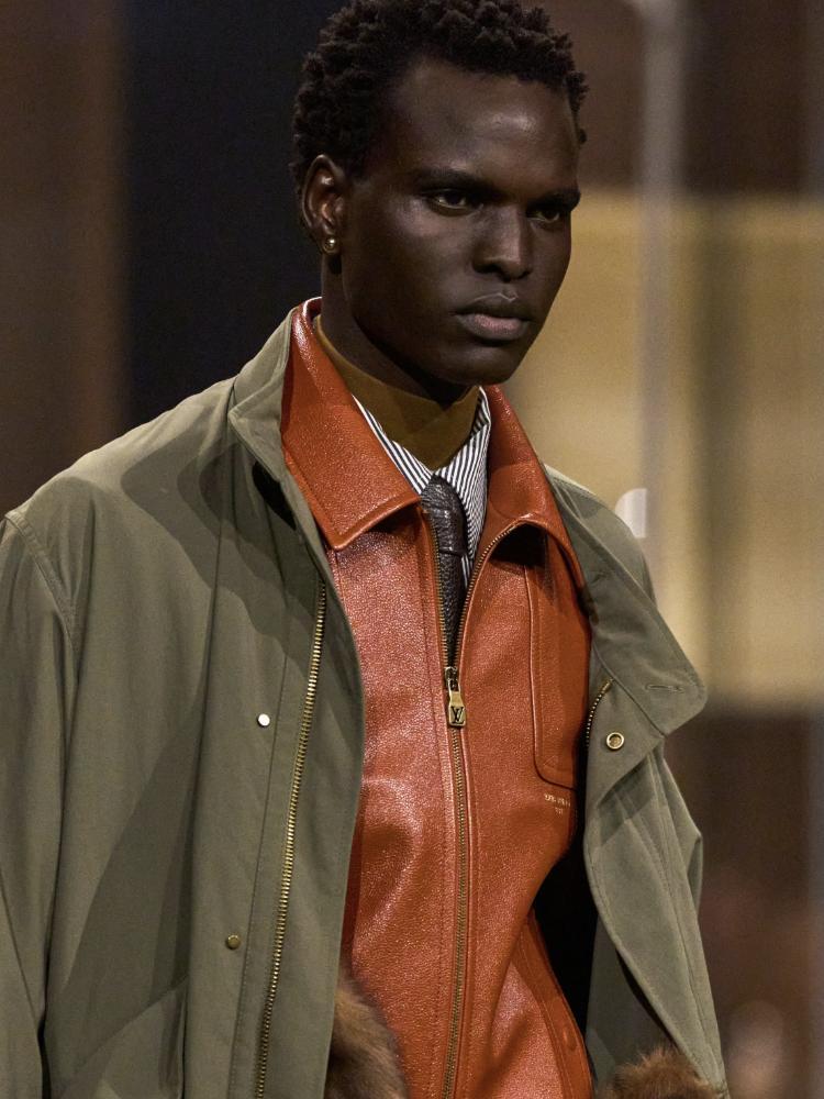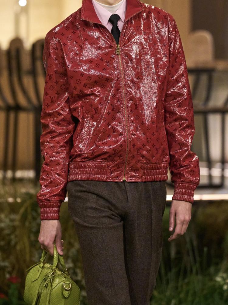比起啞光,今年更流行有光澤感的皮質。Hermes和Louis Vuitton在今年不約而同地選擇了光澤感的皮質夾克,Hermes選擇用漆皮帶來光澤感,Louis Vuitton則用紋理表現皮質質感。