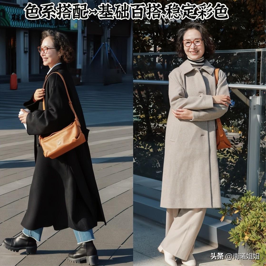 第3個入選的標準大家可以看一下,這位60歲的奶奶,往往都會優先於選擇搭配一些更加基礎百搭的色系,例如像黑白灰在她的日常搭配當中出現頻率是最高的,在秋冬季節的時候像大地色系當中的棕色、卡其色也是受寵的存在。當然了,基礎的色系如果覺得會有一些沉悶或者是無趣,這位60歲的奶奶也會運用一些更加穩定的彩色系列來進行強調。