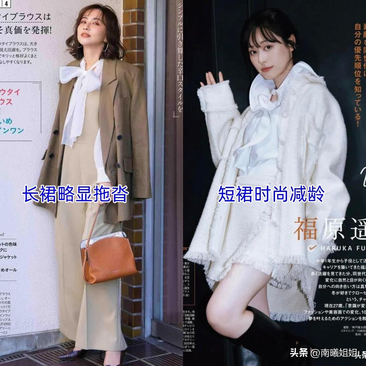 →“搭配黃金線”:裙子長度保證落在膝蓋上方大約2—3釐米的裙裝,是日本雜誌中被反覆驗證過的時尚“安全黃金線”。它能很好滿足了職場中裙裝造型需要的得體感,又能規避掉人到中年裙裝可能會帶來的拖沓問題。
