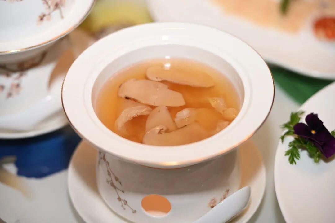 湯品是香格里拉松茸燉鱘龍筋,這是非常考驗火候的功夫湯。鱘龍筋富含膠原蛋白,口感軟糯Q彈,搭配香氣濃郁的香格里拉松茸隔水精燉,湯色清亮但味道醇厚,極具滋補功效。