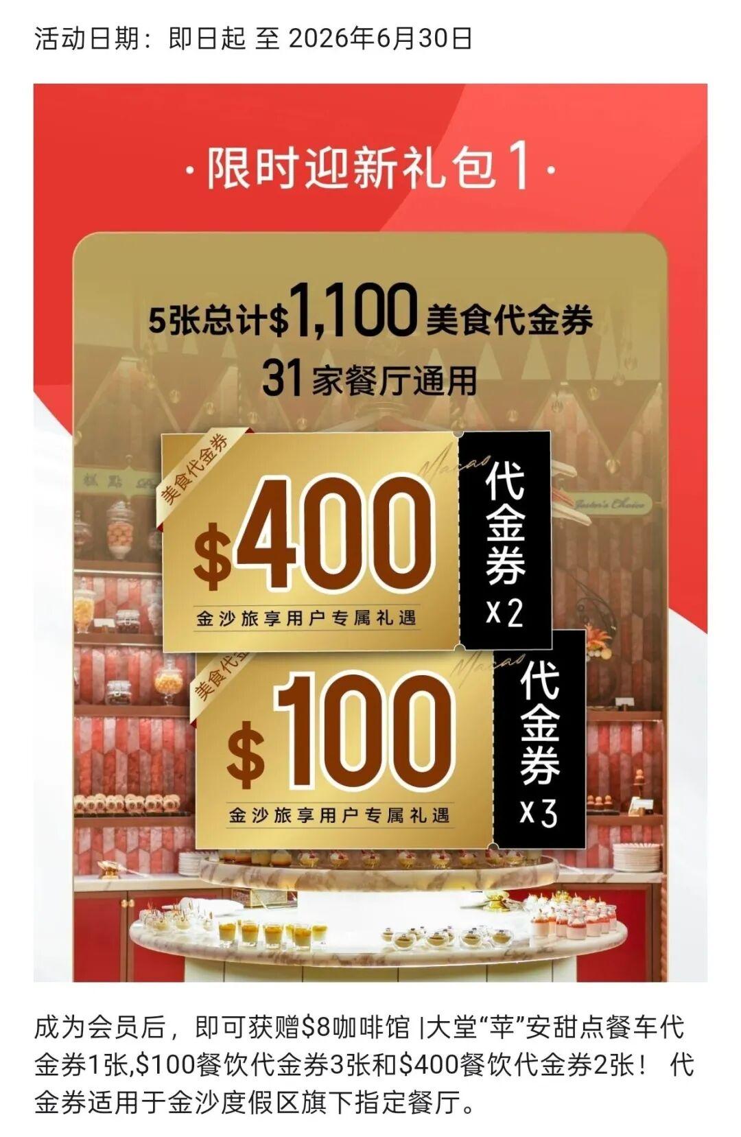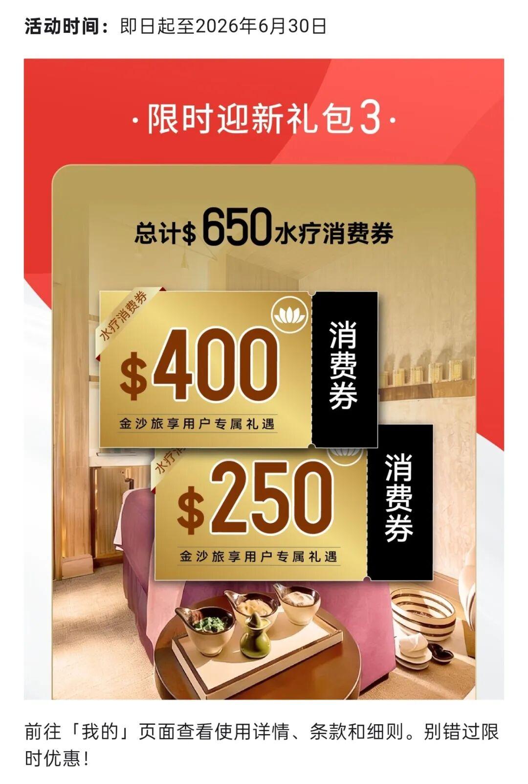 如果你是新用戶,更有真金白銀的實惠:現在下載註冊金沙旅享APP,即可一鍵領取總價值超過澳門幣2000元的“迎新大禮包”,覆蓋餐飲、水療、出行、購物等多個方面,絕對是開啓澳門金沙之旅的最佳方式。