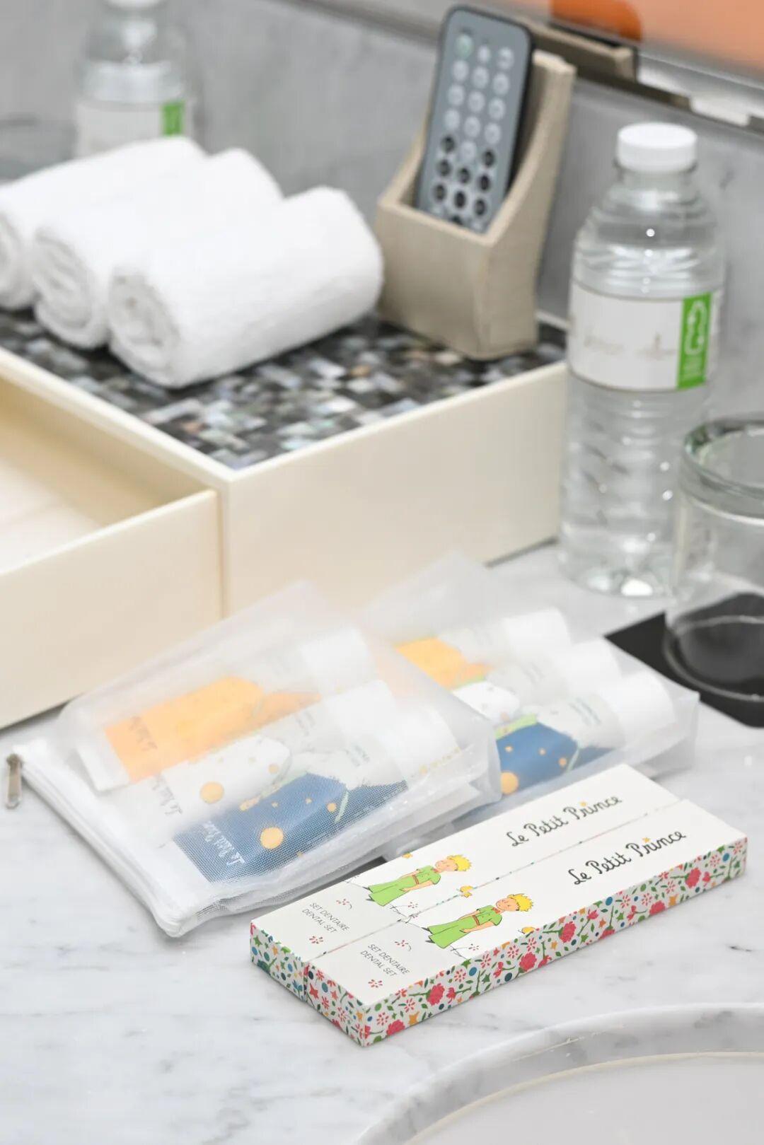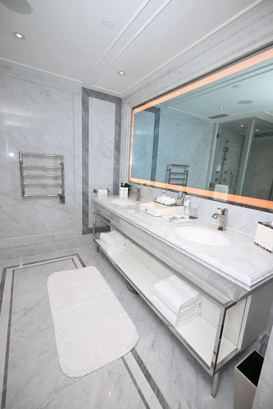 由大理石打造的浴室,整套洗護用品都是Balmain, 酒店還貼心地爲咩咩和兔兔準備了專屬的“小王子”兒童洗漱用品和小浴袍。