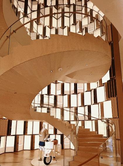 每個來到這裏的人,都會震驚於那座斥資千萬打造的無立柱旋轉樓梯。它僅靠精妙的力學原理支撐,周圍環繞着88個懸浮的經典硬箱,構築出如《盜夢空間》般無限延伸、夢幻交織的視覺衝擊力。