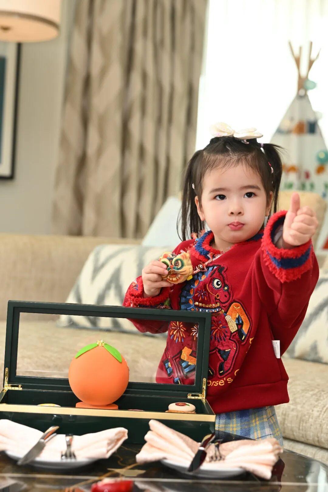 最令人驚豔的莫過於這款蘋果柚子慕斯蛋糕,不僅樣子可愛,還充滿了互動趣味,咩咩和兔兔一眼就喜歡上了。咩咩拿起精緻小木槌,輕輕敲碎紅彤彤的外殼,露出的甜品讓姐妹倆特別驚喜,彷彿也敲開了新年的好運。